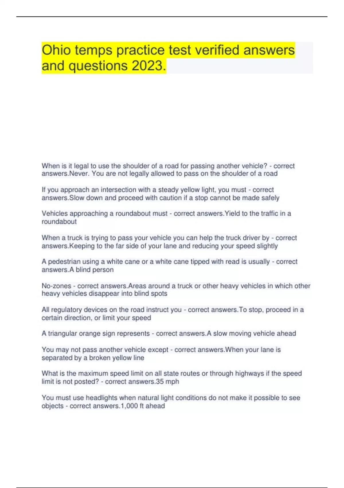 Ohio temps practice test verified answers and questions 2023. When is it legal to use the shoulder of a road for passing another vehicle? - correct answers.Never. You are not legally allowed to pass on the shoulder of a road If you approach an intersection with a steady yellow light, you must - correct answers.Slow down and proceed with caution if a stop cannot be made safely Vehicles approaching a roundabout must - correct answers.Yield to the traffic in a roundabout When a truck is trying to pass your vehicle you can help the truck driver by - correct answers.Keeping to the far side of your lane and reducing your speed slightly A pedestrian using a white cane or a white cane tipped with read is usually - correct answers.A blind person No-zones - correct answers.Areas around a truck or other heavy vehicles in which other heavy vehicles disappear into blind spots All regulatory devices on the road instruct you - correct answers.To stop, proceed in a certain direction, or limit your speed A triangular orange sign represents - correct answers.A slow moving vehicle ahead You may not pass another vehicle except - correct answers.When your lane is separated by a broken yellow line What is the maximum speed limit on all state routes or through highways if the speed limit is not posted? - correct answers.35 mph You must use headlights when natural light conditions do not make it possible to see objects - correct answers.1,000 ft ahead When you are closely following another vehicle at night you must - correct answers.Use low-beam headlights