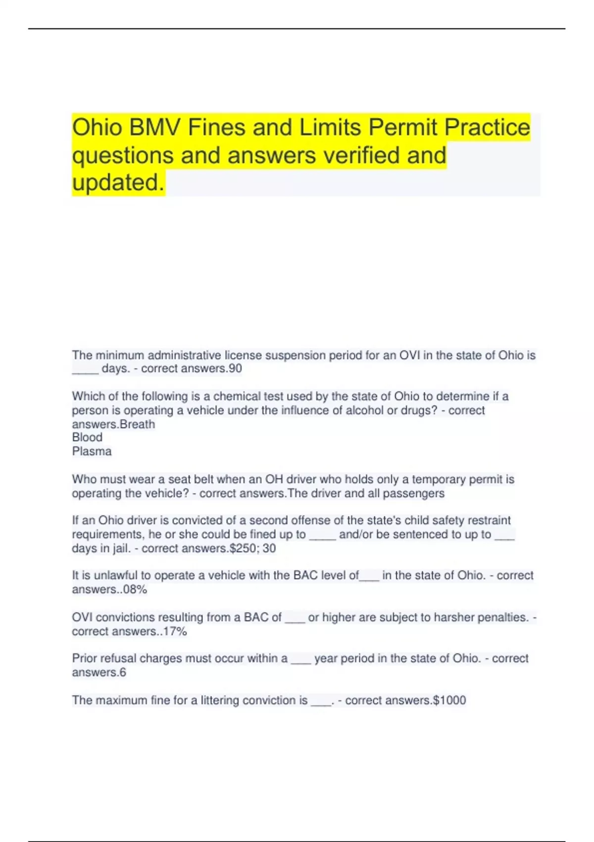 Ohio BMV Fines and Limits Permit Practice questions and answers verified and updated.
