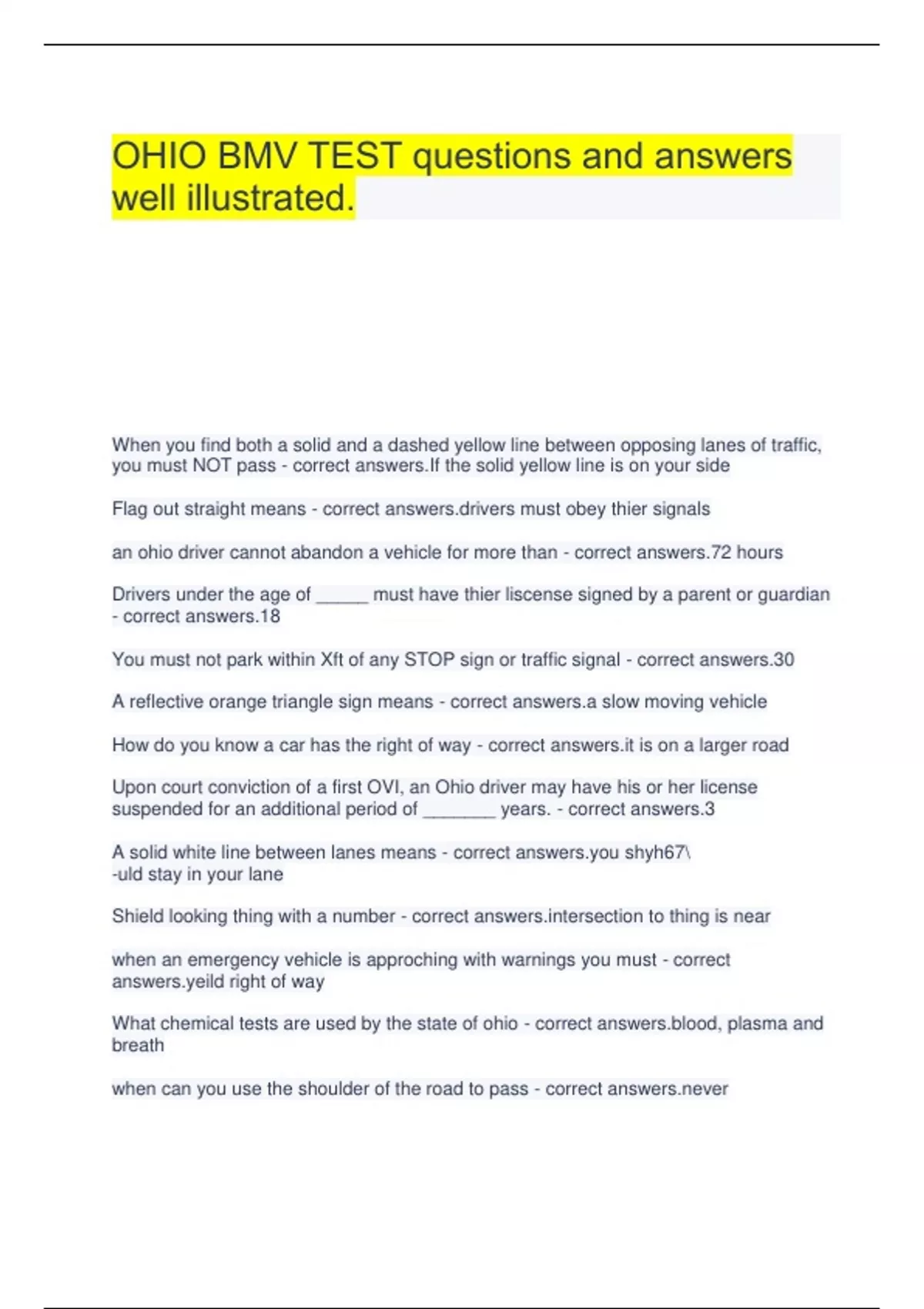 OHIO BMV TEST questions and answers well illustrated. When you find both a solid and a dashed yellow line between opposing lanes of traffic, you must NOT pass - correct answers.If the solid yellow line is on your side Flag out straight means - correct rs must obey thier signals an ohio driver cannot abandon a vehicle for more than - correct answers.72 hours Drivers under the age of _____ must have thier liscense signed by a parent or guardian - correct answers.18 You must not park within Xft of any STOP sign or traffic signal - correct answers.30 A reflective orange triangle sign means - correct answers.a slow moving vehicle How do you know a car has the right of way - correct is on a larger road Upon court conviction of a first OVI, an Ohio driver may have his or her license suspended for an additional period of _______ years. - correct answers.3 A solid white line between lanes means - correct shyh67 -uld stay in your lane Shield looking thing with a number - correct section to thing is near when an emergency vehicle is approching with warnings you must - correct right of way What chemical tests are used by the state of ohio - correct , plasma and breath when can you use the shoulder of the road to pass - correct truck on decline sign - correct decline ahad Upon conviction of his or her second OVI charge, an Ohio driver will have his or her license suspended by the court for at least an additional _______. - correct answers.Year Do not turn on a curve - correct drivers cannot see you from either direction what showcases a driver is under 21 - correct cars turning across - correct yeild to cars going straight The traffic striping marks of diagonal yellow lines are on streets and highways. These indicate - correct answers.The road is narrowing or there is an obstruction on the railway In Ohio, you are legally __________, after stopping at a red traffic signal when the traffic is clear. - correct answers.Allowed to turn right All work zone signs have - correct answers.Orange Background Black letters what does a flashing yellow light indicate - correct rs must proceed with caution Yellow lane markings indicate - correct ic going in opposite directions if your engine dies while making a turn you must - correct to the right side of the road and make a stop Straight arrow with a little arm sign indicates - correct ic merging ahead prior OVI convictions must occur within a period of ___ years - correct answers.6 OVI - correct answers.Operating a Vehicle Impaired If an Ohio driver is determined to have caused or contributed to an accident that caused death while driving under the influence, his or her license will be suspended - correct answers.Permanently Bump with wiggally arrows sign - correct ed highway ends ahhead One one way streets driver cannot park more than X Inches away from the curb - correct answers.12