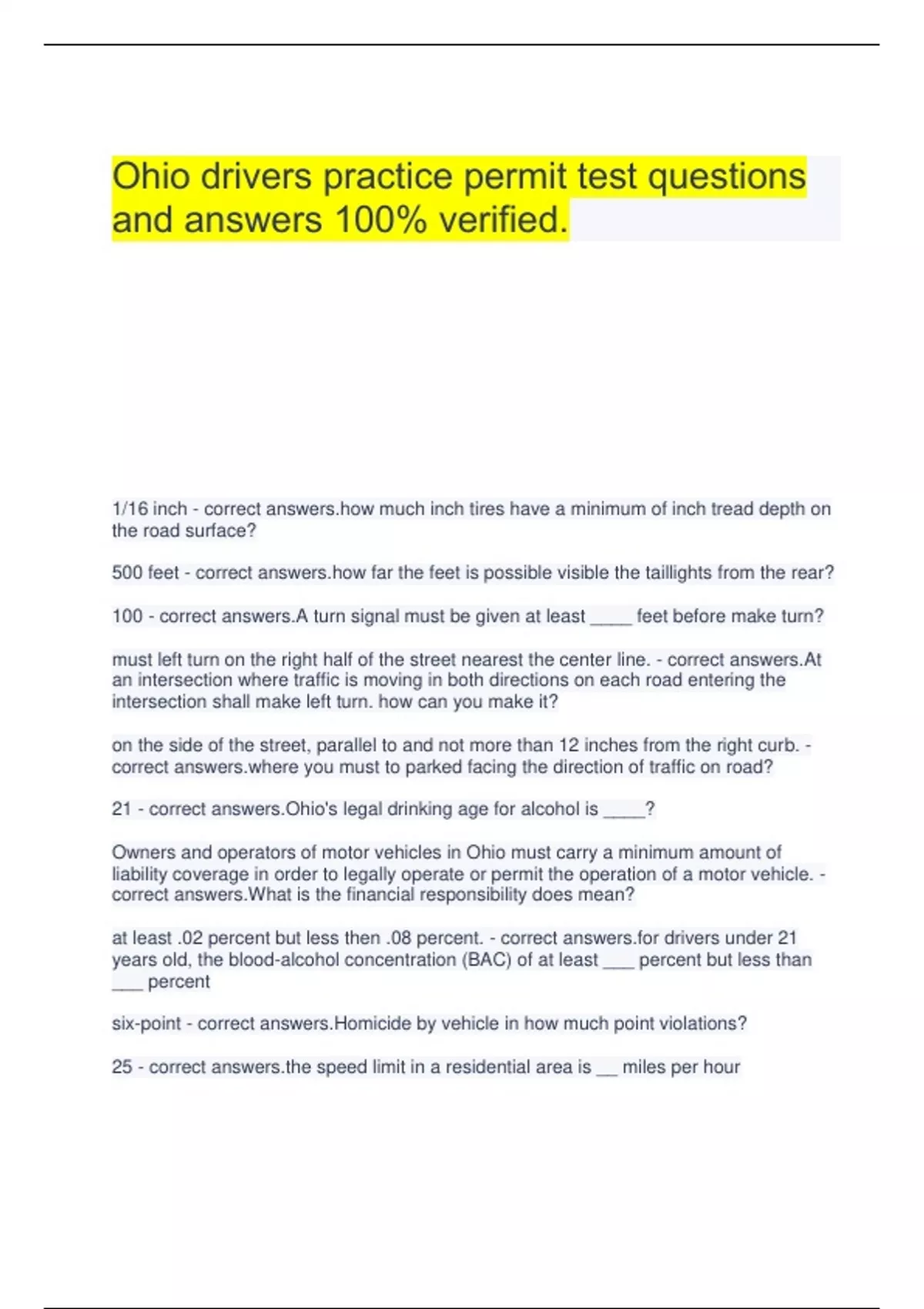 Ohio drivers practice permit test questions and answers 100% verified. 1/16 inch - correct much inch tires have a minimum of inch tread depth on the road surface? 500 feet - correct far the feet is possible visible the taillights from the rear? 100 - correct answers.A turn signal must be given at least ____ feet before make turn? must left turn on the right half of the street nearest the center line. - correct answers.At an intersection where traffic is moving in both directions on each road entering the intersection shall make left turn. how can you make it? on the side of the street, parallel to and not more than 12 inches from the right curb. - correct you must to parked facing the direction of traffic on road? 21 - correct answers.Ohio's legal drinking age for alcohol is ____? Owners and operators of motor vehicles in Ohio must carry a minimum amount of liability coverage in order to legally operate or permit the operation of a motor vehicle. - correct answers.What is the financial responsibility does mean? at least .02 percent but less then .08 percent. - correct drivers under 21 years old, the blood-alcohol concentration (BAC) of at least ___ percent but less than ___ percent six-point - correct answers.Homicide by vehicle in how much point violations? 25 - correct speed limit in a residential area is __ miles per hour A stop sign - correct answers.A flash red traffic signal at an intersection has the same requirements as which of the following? true - correct answers.In bicycles law, the bicyclists should must keep to the right edge of the roadway and allowing faster traffic to safely pass. is that statement true or false? the fatigue is a significant factor in highway crushes caused by tired to sleep while you are driving - correct is the fatigue does mean? 1-Play the radio 2-Engage in light conversation 3-Stop and stretch your arms & legs or have either a cup of coffee or cold drinks. 4- pull off the road and rest - correct can you get rid of fatigue? 1-in between sunset and sunrise. 2- during any period of rain, snow, fog - correct is the important you use lights while driving? 1,000 feet - correct far is the feet to clearly see object by the lights E-Check Certificate - correct answers.What name is called for Ohio's automobile emissions test must be required before a motor vehicle can be registered in these counties? Drive with caution. - correct answers.What would you do when facing the following Traffic signals: FLASHING Yellow ? From a one way to a one way - correct answers.When can you make a left on red? The driver to the left - correct answers.If an intersection has no traffic control lights or stop signs and two cars approach the intersection at the same time from different directions, which driver must yield? Get into the right lane of traffic and finish your turn in the right lane of traffic when clear to do so - correct answers.When you are making a right turn, you must Prepare to stop for red light. - correct answers.What would you do when facing the following Traffic signal:... STEADY Yellow Yellow and diamond shaped with black lettering or symbols - correct answers.What is the usual color and shape of a Warning Sign? Yellow with black letters and "X" symbol - correct answers.What color and shape is a Railroad Crossing Warning Sign?