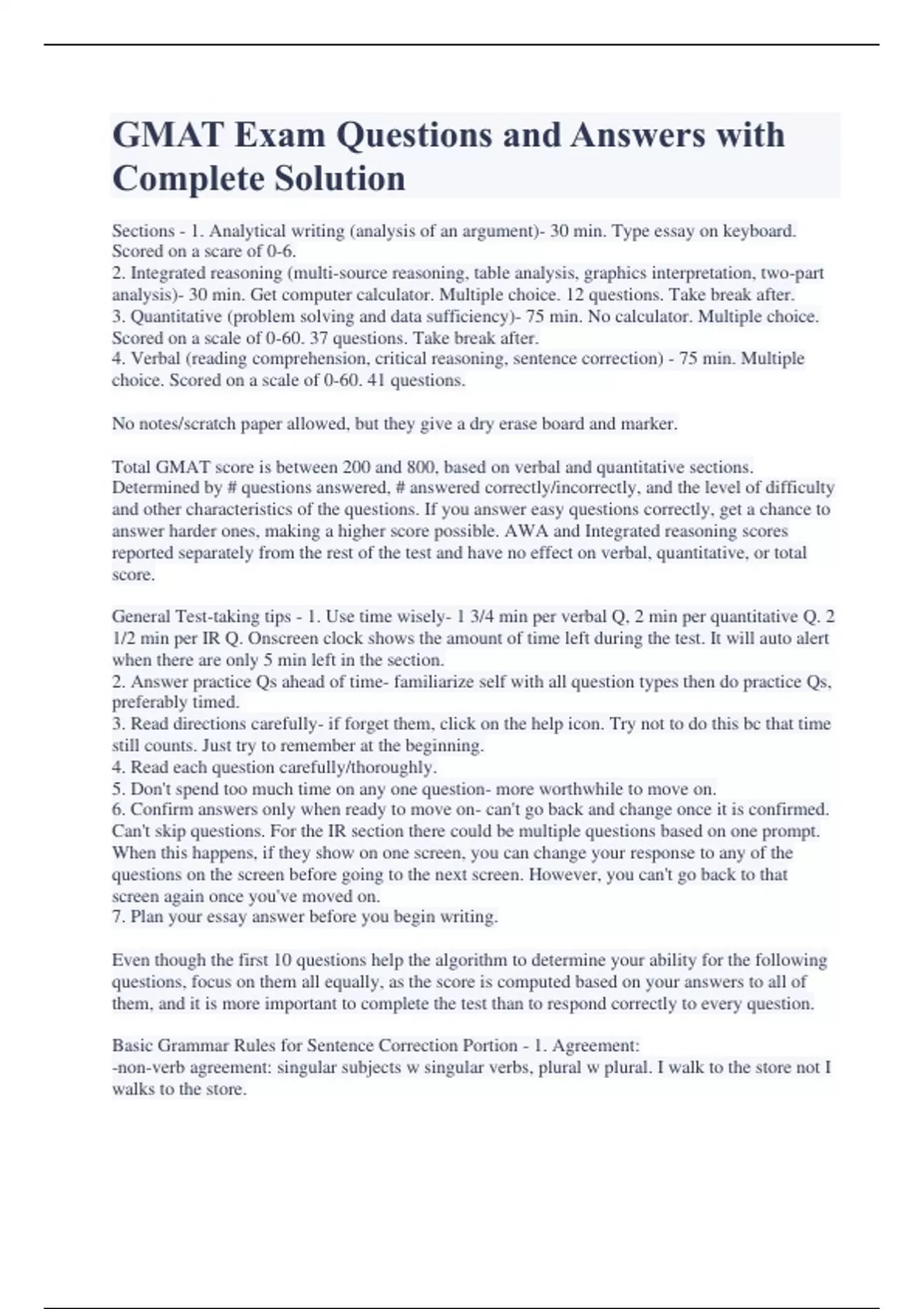 GMAT Exam Questions and Answers with Complete Solution Sections - 1. Analytical writing (analysis of an argument)- 30 min. Type essay on keyboard. Scored on a scare of 0-6. 2. Integrated reasoning (multi-source reasoning, table analysis, graphics interpretation, two-part analysis)- 30 min. Get computer calculator. Multiple choice. 12 questions. Take break after. 3. Quantitative (problem solving and data sufficiency)- 75 min. No calculator. Multiple choice. Scored on a scale of 0-60. 37 questions. Take break after. 4. Verbal (reading comprehension, critical reasoning, sentence correction) - 75 min. Multiple choice. Scored on a scale of 0-60. 41 questions. No notes/scratch paper allowed, but they give a dry erase board and marker. Total GMAT score is between 200 and 800, based on verbal and quantitative sections. Determined by # questions answered, # answered correctly/incorrectly, and the level of difficulty and other characteristics of the questions. If you answer easy questions correctly, get a chance to answer harder ones, making a higher score possible. AWA and Integrated reasoning scores reported separately from the rest of the test and have no effect on verbal, quantitative, or total score. General Test-taking tips - 1. Use time wisely- 1 3/4 min per verbal Q, 2 min per quantitative Q. 2 1/2 min per IR Q. Onscreen clock shows the amount of time left during the test. It will auto alert when there are only 5 min left in the section. 2. Answer practice Qs ahead of time- familiarize self with all question types then do practice Qs, preferably timed. 3. Read directions carefully- if forget them, click on the help icon. Try not to do this bc that time still counts. Just try to remember at the beginning. 4. Read each question carefully/thoroughly. 5. Don't spend too much time on any one question- more worthwhile to move on. 6. Confirm answers only when ready to move on- can't go back and change once it is confirmed. Can't skip questions. For the IR section there could be multiple questions based on one prompt. When this happens, if they show on one screen, you can change your response to any of the questions on the screen before going to the next screen. However, you can't go back to that screen again once you've moved on. 7. Plan your essay answer before you begin writing. Even though the first 10 questions help the algorithm to determine your ability for the following questions, focus on them all equally, as the score is computed based on your answers to all of them, and it is more important to complete the test than to respond correctly to every question. Basic Grammar Rules for Sentence Correction Portion - 1. Agreement: -non-verb agreement: singular subjects w singular verbs, plural w plural. I walk to the store not I walks to the store. -pronoun agreement: pronoun must agree w/ noun/pronoun it refers to in person, number, and gender. When you dream, you are usually asleep, not when one dreams, you are usually asleep. 2. Diction: -among vs between: among refers to relationships involving 2 objects. Between is for relationships with only 2 objects. -as vs like: As can be a preposition meaning "in capacity of" or can be a conjunction of manner followed by a verb. Like is used as a preposition, and should be followed by a noun, object pronoun, or verb ending in -ing. -mass and count words: mass words are nouns quantified by an amount rather than a number. Count words are nouns quantified by a number. -pronouns: myself shouldn't substitute I or me. 3. Grammatical Construction: -fragments: parts of a sentence disconnected from the main clause. -run-on sentences: two independent clauses that run together without proper punctuation. -constructions: wordy and redundant. 4. Idiom: Nonstandard expressions should be avoided, although English idioms don't always follow conventional grammatical rules. Be sure to use the correct idiom when using the constructions and parts of speech. -Prepositions: specific prepositions have specific purposes jog in the morning vs jog on the morning. -Correlatives: word combos such as "not only... but also" should be followed by an element of the same grammatical type. -Forms of comparison: fewer refers to a specific number, whereas less than refers to a continuous quantity. Between... and is the correct for to designate a choice. Farther is for distance, further refers to degree. 5. Logical Predication: phrases detracting from the logical argument. -modification problems: modifiers should be positioned so it is clear what word(s) they are modifying. I put the cake that I baked by the door not I put the ake by the door that I baked. 6. Parallelism: making sure different elements in a sentence balance one another. The only way to know is to take the plunge, not the only way to know is taking the plunge. 7. Rhetorical construction: Awkward, wordy, redundant, imprecise, or unclear constructions should be avoided even when they are free of grammatical errors. 8. Verb Form: correct tenses. -present perfect: has/have + verb. -past perfect: had + verb. -future perfect: will have. -present progressive: ongoing action that is happening now, used with am, is, or are + verb-ing. -past progressive: was or were + verb-ing. -future progressive: will be or shall be + verb-ing. -present perfect progressive: have been or has been + verb-ing. -past perfect progressive: had been + verb-ing. -future perfect progressive: will have been + verb-ing. Properties of Integers - An integer is any number in a set {-1, 0, 1}. If x and y are integers and x 0, x is a factor of y as long as y=xn for some integer n. In other words, y would be divisible by/a multiple of x. A quotient is the number that can be evenly divided into another, the remainder is what is left over if it is not even. y is divisible by x only if the remainder is 0. When a small integer is divided by a large integer, the quotient is 0 and the remainder is the small integer. (5/7= 7(0) + 5). Integers divisible by two are called 