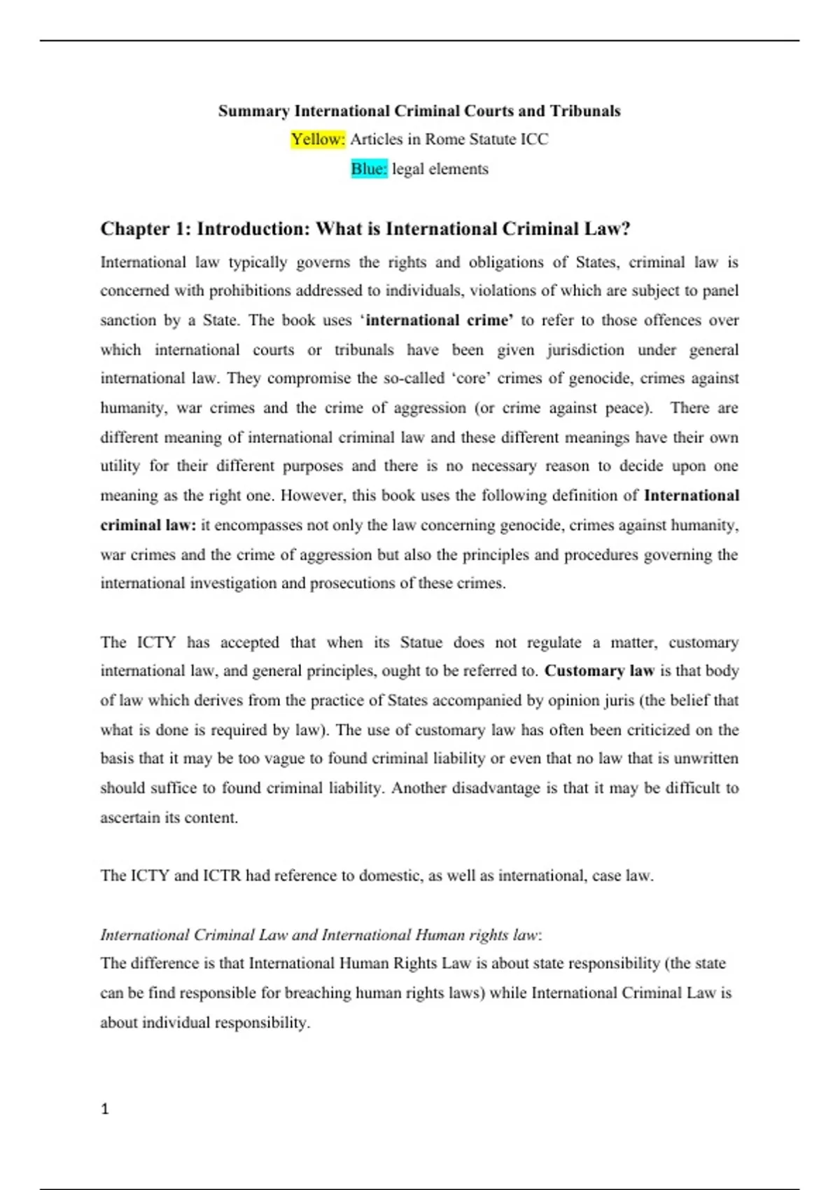 Summary for the course International Criminal Courts and Tribunals. Chapters 1, 7, 8, 9, 10, 11, 12, and 13. This summary includes all the legal elements of the four international core crimes: war crimes, crimes against humanity, crime of genocide, and crime of aggression. This summary was sufficient for the exam of last year (academic year 2022)