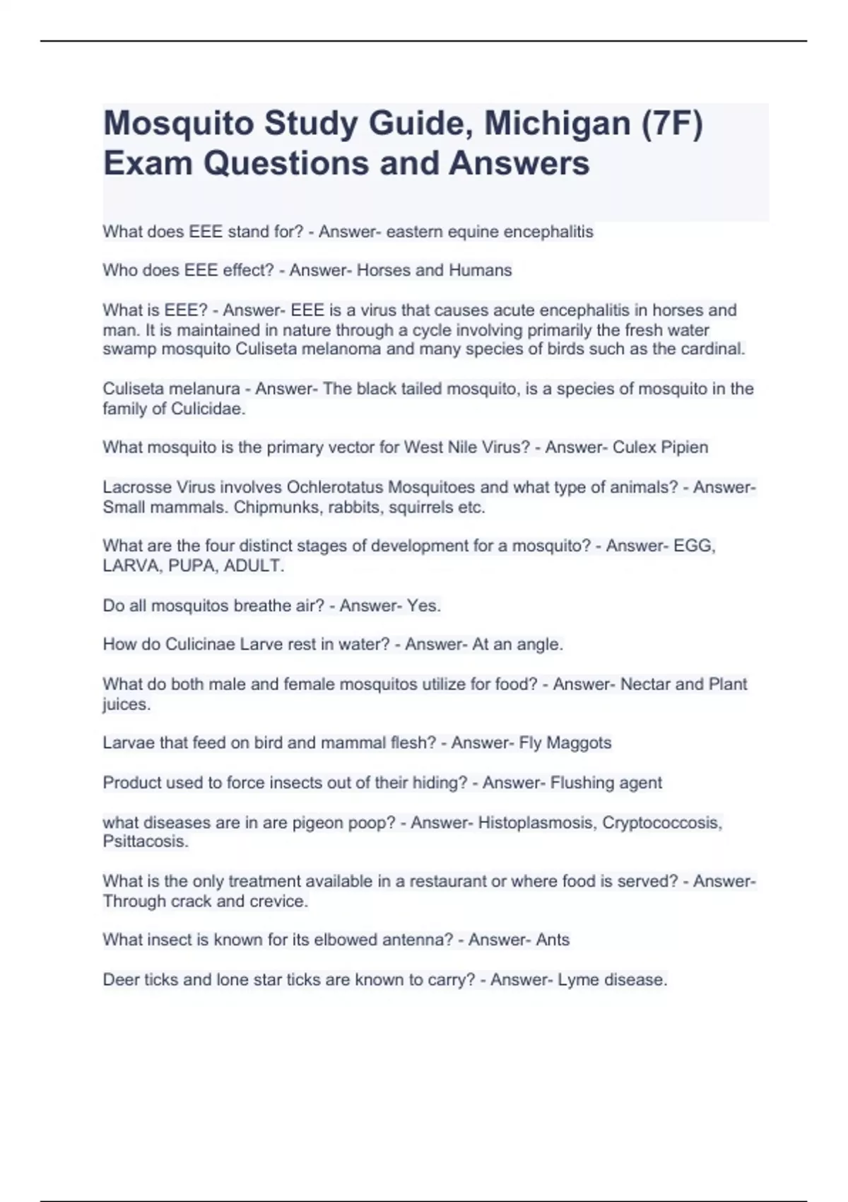 Mosquito Study Guide, Michigan (7F) Exam Questions and Answers