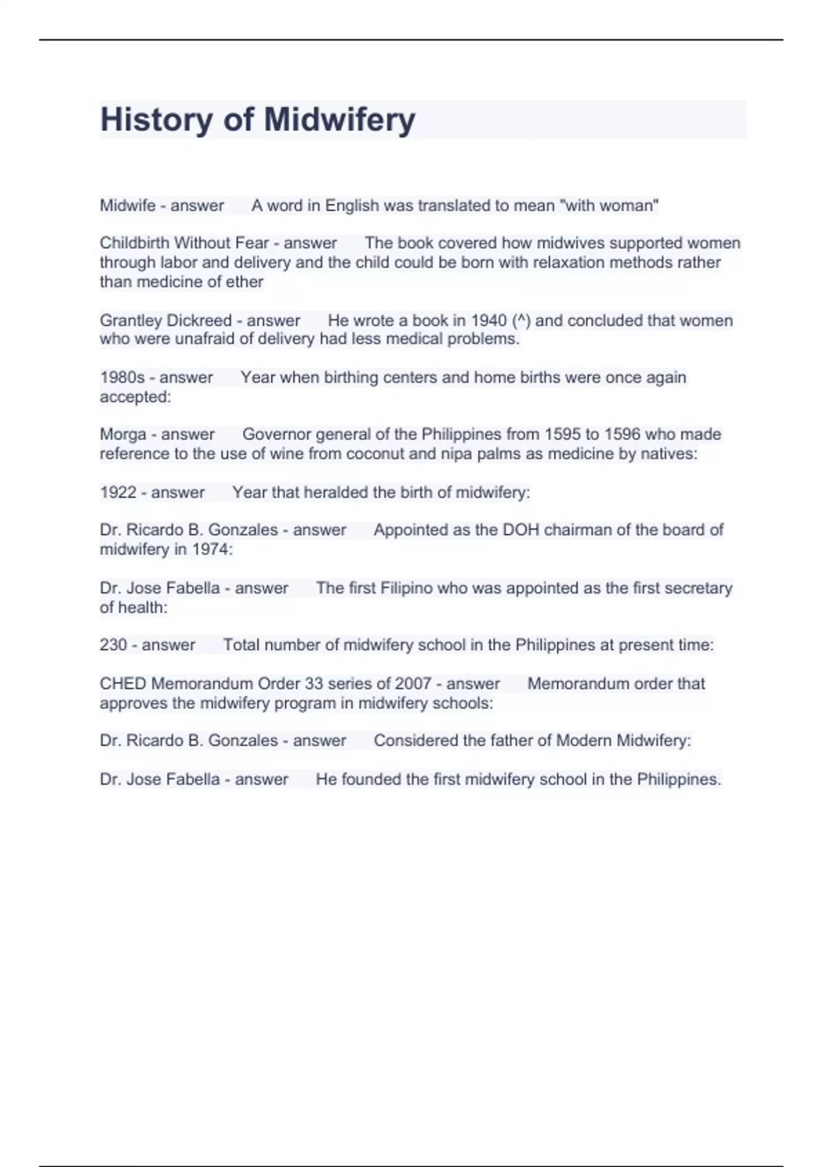History of Midwifery Questions with correct Answers
