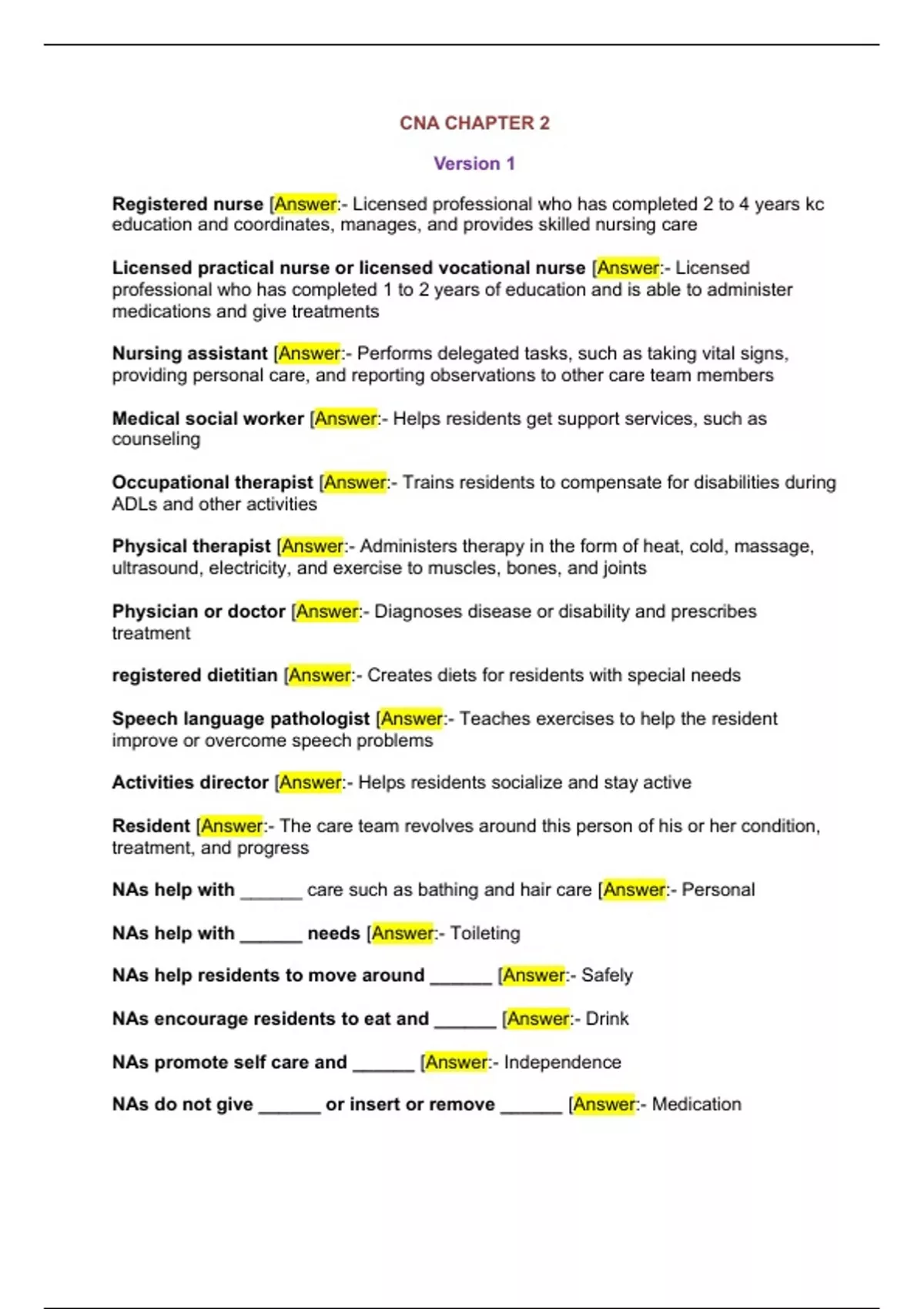 CNA Chapter 2 Exam (2 Versions) Verified Questions and Answers (Best Document for Preparation)