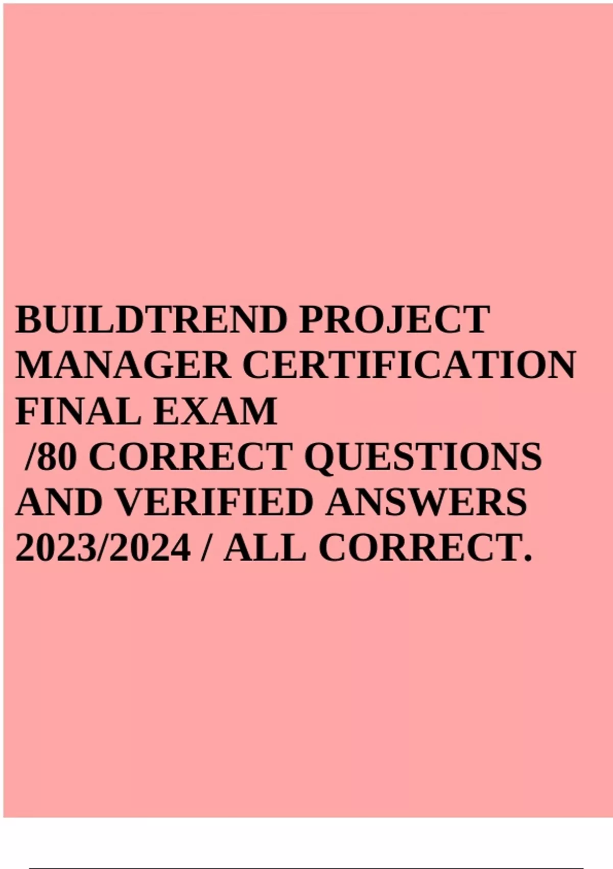 BUILDTREND PROJECT MANAGER CERTIFICATION FINAL EXAM /80 CORRECT QUESTIONS AND VERIFIED ANSWERS 2023/2024 / ALL CORRECT.