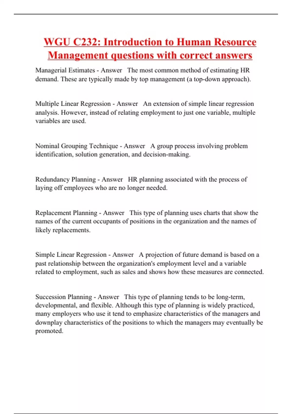 WGU C232: Introduction to Human Resource Management questions with correct answers