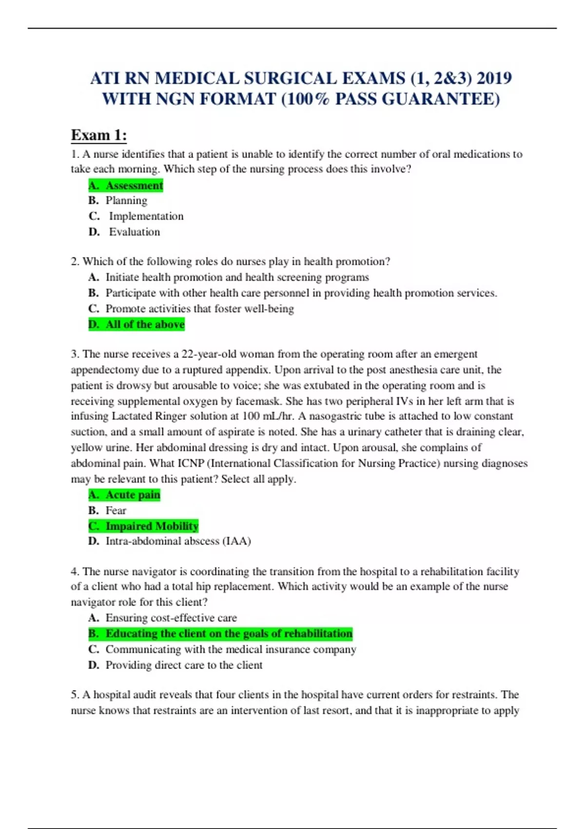 ATI RN MEDICAL SURGICAL EXAMS (1, 2&3) 2019 WITH NGN FORMAT (100% PASS GUARANTEE) Exam 1: 1. A nurse identifies that a patient is unable to identify the correct number of oral medications to take each morning. Which step of the nursing process does this involve? A. Assessment B. Planning C. Implementation D. Evaluation 2. Which of the following roles do nurses play in health promotion? A. Initiate health promotion and health screening programs B. Participate with other health care personnel in providing health promotion services. C. Promote activities that foster well-being D. All of the above 3. The nurse receives a 22-year-old woman from the operating room after an emergent appendectomy due to a ruptured appendix. Upon arrival to the post anesthesia care unit, the patient is drowsy but arousable to voice; she was extubated in the operating room and is receiving supplemental oxygen by facemask. She has two peripheral IVs in her left arm that is infusing Lactated Ringer solution at 100 mL/hr. A nasogastric tube is attached to low constant suction, and a small amount of aspirate is noted. She has a urinary catheter that is draining clear, yellow urine. Her abdominal dressing is dry and intact. Upon arousal, she complains of abdominal pain. What ICNP (International Classification for Nursing Practice) nursing diagnoses may be relevant to this patient? Select all apply. A. Acute pain B. Fear C. Impaired Mobility D. Intra-abdominal abscess (IAA) 4. The nurse navigator is coordinating the transition from the hospital to a rehabilitation facility of a client who had a total hip replacement. Which activity would be an example of the nurse navigator role for this client? A. Ensuring cost-effective care B. Educating the client on the goals of rehabilitation C. Communicating with the medical insurance company D. Providing direct care to the client 5. A hospital audit reveals that four clients in the hospital have current orders for restraints. The nurse knows that restraints are an intervention of la
