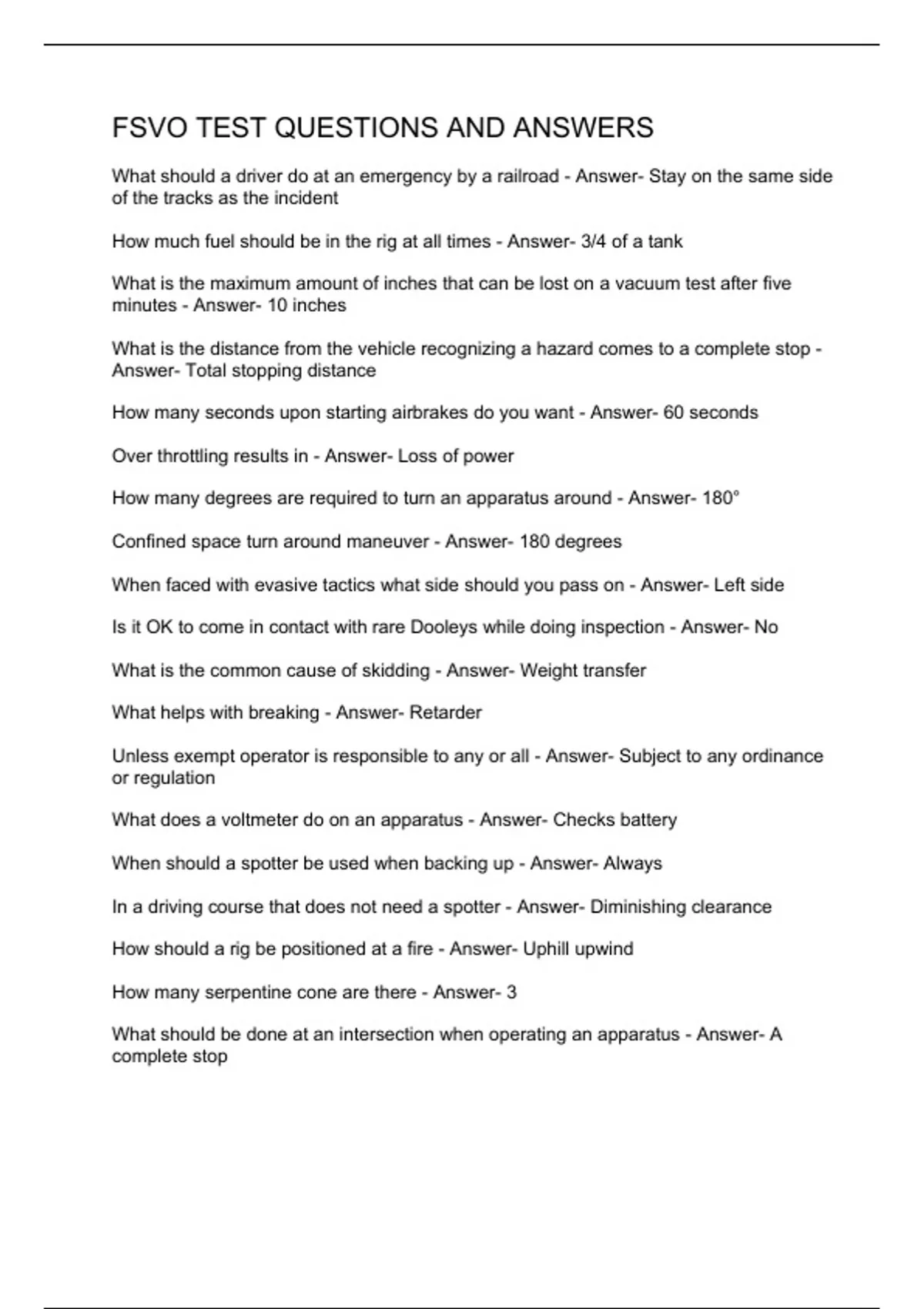 What should a driver do at an emergency by a railroad - Answer- Stay on the same side of the tracks as the incident How much fuel should be in the rig at all times - Answer- 3/4 of a tank What is the maximum amount of inches that can be lost on a vacuum test after five minutes - Answer- 10 inches What is the distance from the vehicle recognizing a hazard comes to a complete stop - Answer- Total stopping distance How many seconds upon starting airbrakes do you want - Answer- 60 seconds Over throttling results in - Answer- Loss of power How many degrees are required to turn an apparatus around - Answer- 180° Confined space turn around maneuver - Answer- 180 degrees When faced with evasive tactics what side should you pass on - Answer- Left side Is it OK to come in contact with rare Dooleys while doing inspection - Answer- No What is the common cause of skidding - Answer- Weight transfer What helps with breaking - Answer- Retarder Unless exempt operator is responsible to any or all - Answer- Subject to any ordinance or regulation What does a voltmeter do on an apparatus - Answer- Checks battery When should a spotter be used when backing up - Answer- Always In