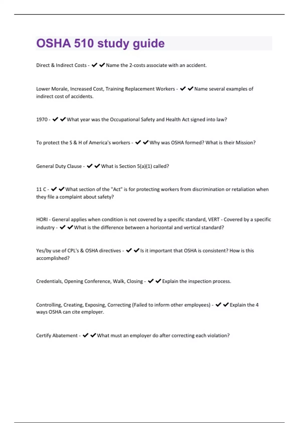 Direct & Indirect Costs - Name the 2-costs associate with an accident. Lower Morale, Increased Cost, Training Replacement Workers - Name several examples of indirect cost of accidents. 1970 - What year was the Occupational Safety and Health Act signed into law? To protect the S & H of America's workers - Why was OSHA formed? What is their Mission? General Duty Clause - What is Section 5(a)(1) called? 11 C - What section of the "Act" is for protecting workers from discrimination or retaliation when they file a complaint about safety? HORI - General applies when condition is not covered by a specific standard, VERT - Covered by a specific industry - What is the difference between a horizontal and vertical standard? Yes/by use of CPL's & OSHA directives - Is it important that OSHA is consistent? How is this accomplished? Credentials, Opening Conference, Walk, Closing - Explain the inspection process. Controlling, Creating, Exposing, Correcting (Failed to inform other employees) - Explain the 4 ways OSHA can cite employer. Certify Abatement - What must an employer do after correcting each violation?Lost Workday: (Not at work) Restricted work: Only able to work a (Partial Shift) - Define the difference between a lost workday case and a restricted case.