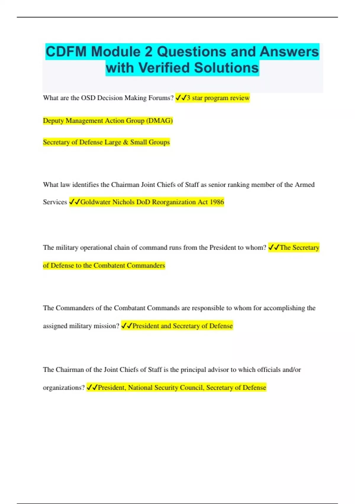 CDFM Module 2 Questions and Answers with Verified Solutions What are the OSD Decision Making Forums? 3 star program review Deputy Management Action Group (DMAG) Secretary of Defense Large & Small Groups What law identifies the Chairman Joint Chiefs of Staff as senior ranking member of the Armed Services Goldwater Nichols DoD Reorganization Act 1986 The military operational chain of command runs from the President to whom? The Secretary of Defense to the Combatent Commanders The Commanders of the Combatant Commands are responsible to whom for accomplishing the assigned military mission? President and Secretary of Defense The Chairman of the Joint Chiefs of Staff is the principal advisor to which officials and/or organizations? President, National Security Council, Secretary of Defense Who serves as Chairman of the National Security Council President Name the three major phases of the PPBE process that result in the DoD portion of the Presidents Budget that is submitted to Congress Planning, Programming, Budget What is the name of the process used by the DoD to determine the dollar amounts for programs to be submitted to Congress as part of the Presidents Budget PPBE (planning, programming, Budget, execution) What is the title of the senior OSD official responsible for the planning phase of the PPBE process Under Secretary of Defense (Policy) What is the title of the senior OSD official who is responsible for issuing programming guidance? Director, Cost Assessment and Program evaluation D,CAPE What is the title of the senior OSD official who is principal advisor and assistent to the SECDEF for budget and financial matters? Under Secretary of Defense (Comptroller)/Chief Financial Officer The Under Secretary of Defense (Acquisition, Technology & Logistics) serves as the Chairman of what Board Defense Acquisition Board (DAB) Assume todays date is 1 March 2014 and your organization knows about a new project or requirement that will require its initial funding in FY 2021. What is the first PPBE related document in which you could identify resources for that requirement POM What is the title of the final document of the planning phase? Defense Planning Guidance (DPG) What is the title of the document prepared by the D,CAPE and USD(C) in the May to June time frame that provides guidance to Components for preparation of their POM and BES submissions? Integrated Program/Budget Review Guidance What is the name of the automated database that summarizes all forces, resources, and equipment associated with programs approved by the Secretary of Defense? Future Years Defense Program (FYDP) What