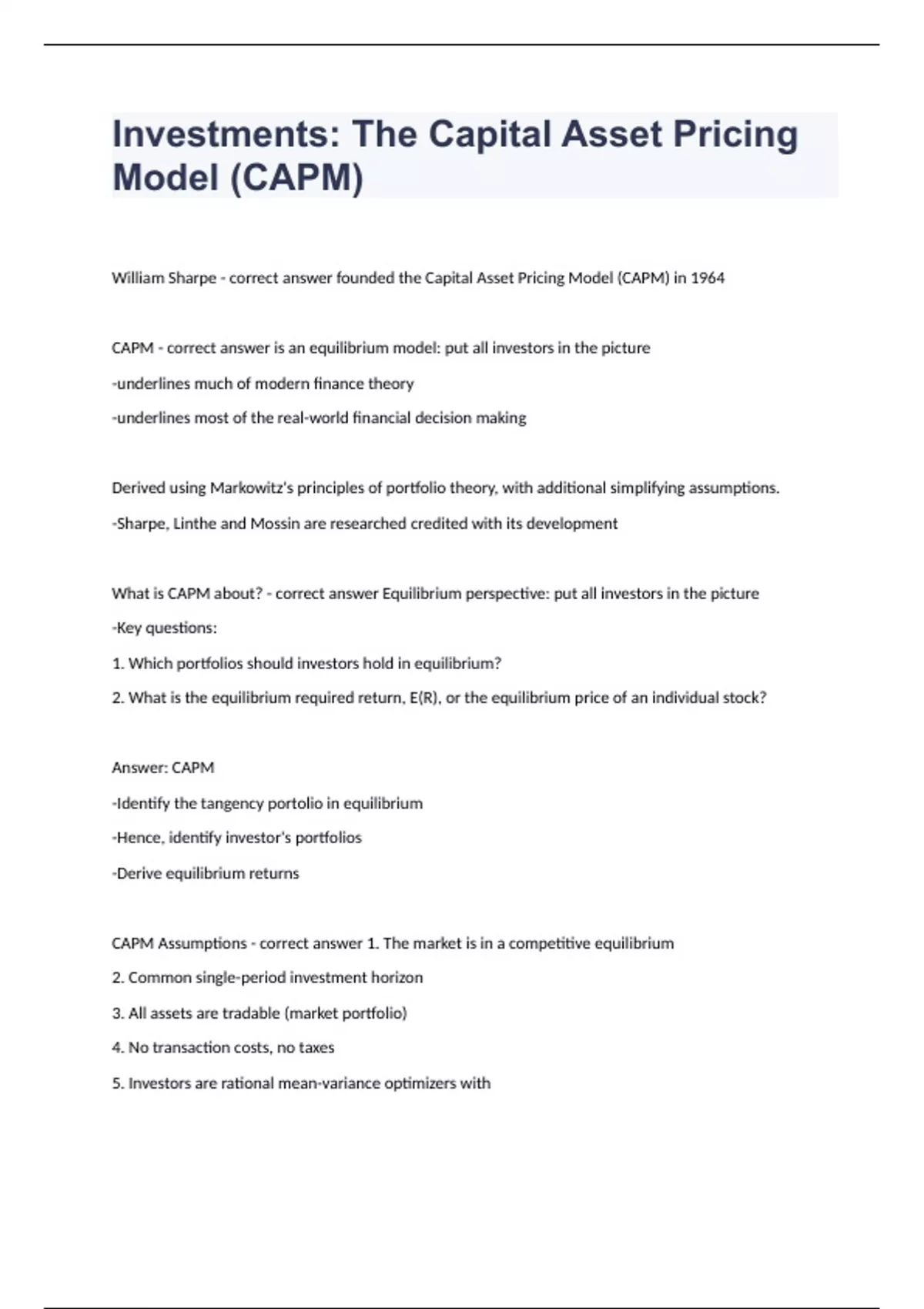 Investments The Capital Asset Pricing Model (CAPM) 2023 passed