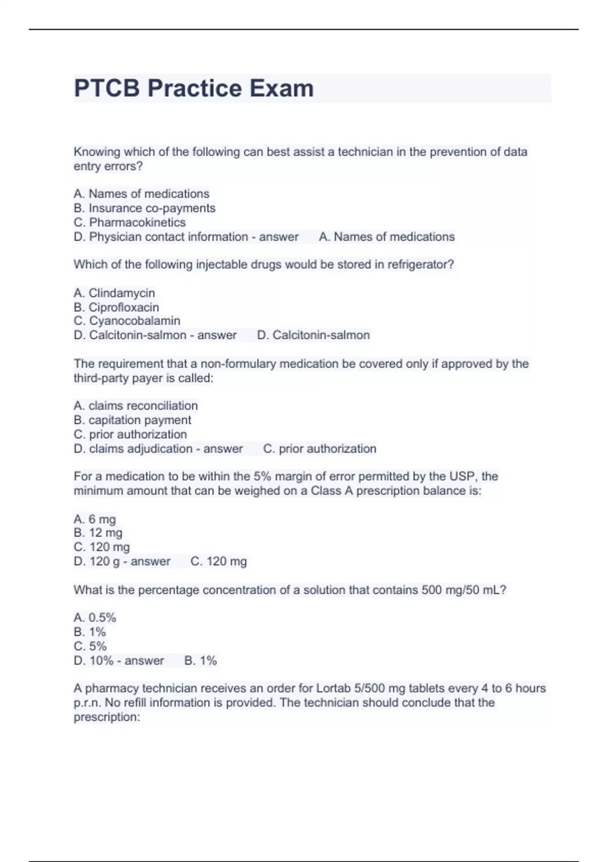 PTCB Practice Exam Questions with correct Answers