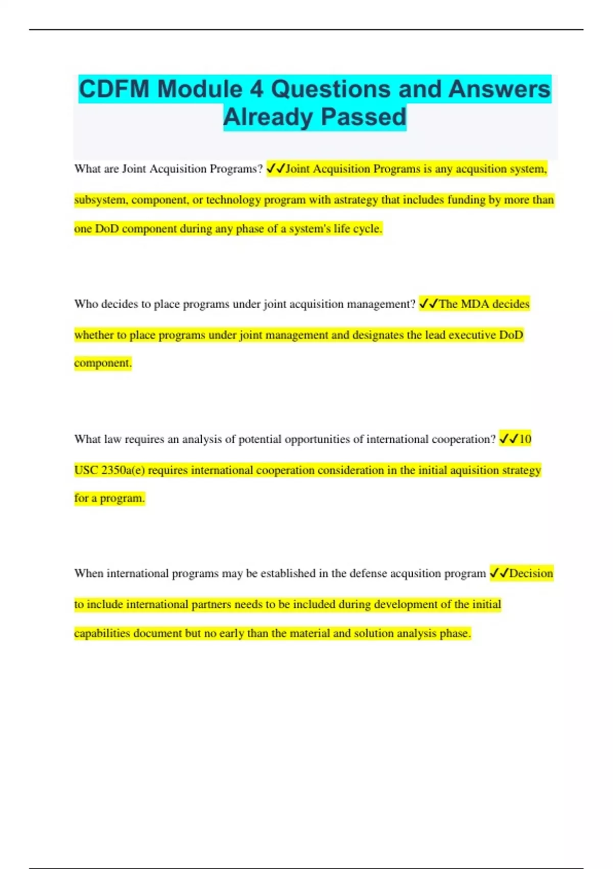 CDFM Module 4 Questions and Answers Already Passed What are Joint Acquisition Programs? Joint Acquisition Programs is any acqusition system, subsystem, component, or technology program with astrategy that includes funding by more than one DoD component during any phase of a system's life cycle. Who decides to place programs under joint acquisition management? The MDA decides whether to place programs under joint management and designates the lead executive DoD component. What law requires an analysis of potential opportunities of international cooperation? 10 USC 2350a(e) requires international cooperation consideration in the initial aquisition strategy for a program. When international programs may be established in the defense acqusition program Decision to include international partners needs to be included during development of the initial capabilities document but no early than the material and solution analysis phase. When is Earned Value Management (EVM) implemented EVM is part of program management . It ensures that cost , schedule and technical aspects of the contract are truly integrated. In what type of contracts EVM is required