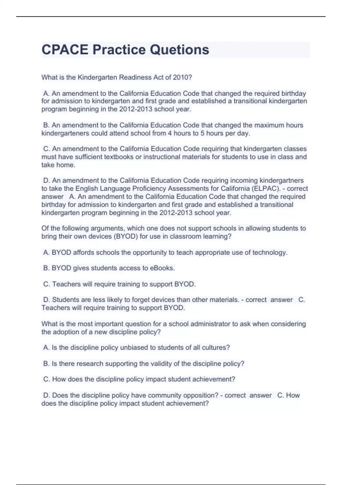 cpace practice questions and answers correctly sol