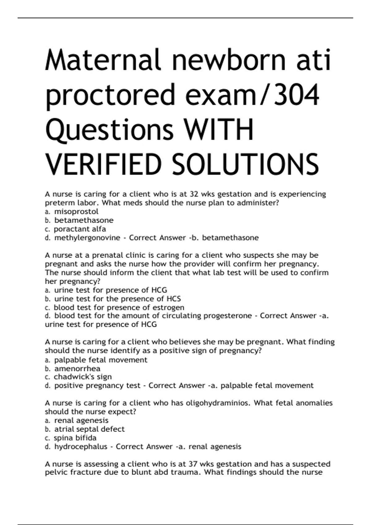Maternal newborn ati proctored exam/304 Questions WITH VERIFIED SOLUTIONS A nurse is caring for a client who is at 32 wks gestation and is experiencing preterm labor. What meds should the nurse plan to administer? a. misoprostol b. betamethasone c. poractant alfa d. methylergonovine - Correct Answer -b. betamethasone A nurse at a prenatal clinic is caring for a client who suspects she may be pregnant and asks the nurse how the provider will confirm her pregnancy. The nurse should inform the client that what lab test will be used to confirm her pregnancy? a. urine test for presence of HCG b. urine test for the presence of HCS c. blood test for presence of estrogen d. blood test for the amount of circulating progesterone - Correct Answer -a. urine test for presence of HCG A nurse is caring for a client who believes she may be pregnant. What finding should the nurse identify as a positive sign of pregnancy? a. palpable fetal movement b. amenorrhea c. chadwick's sign d. positive pregnancy test - Correct Answer -a. palpable fetal movement A nurse is caring for a client who has oligohydraminios. What fetal anomalies should the nurse expect? a. renal agenesis b. atrial septal defect c. spina bifida d. hydrocephalus - Correct Answer -a. renal agenesis A nurse is assessing a client who is at 37 wks gestation and has a suspected pelvic fracture due to blunt abd trauma. What findings should the nurse expect? a. uterine contractions b. bradycardia c. seizures d. bradypnea - Correct Answer -a. uterine contractions The nurse should expect the client to be experiencing uterine contractions due to abdominal trauma. A nurse is assessing a client who is at 12 wks gestation and has hydatidiform mole. What findings should the nurse expect? a. hypothermia b. dark brown vaginal discharge c. fetal heart tones d. decreased urinary output - Correct Answer -b. dark brown vaginal discharge A hydatidiform mole, or a molar pregnancy, is a benign proliferative growth of the chorionic villi, which gives rise to multiple cysts. The products of conception transform into a large number of edematous, fluid-filled vesicles. As cells slough off the uterine wall, vaginal discharge is usually dark brown and can contain grapelike clusters. A nurse is assessing a client who is at 35 weeks of gestation and has mild gestational HTN. What finding should the nurse identify as the priority? a. 480 mL urine output in 24 hrs b. 1+ protein in the urine c. +2 edema of the feet d. BP 144/92 - Correct Answer -a. 480 mL urine output in 24 hrs When using the urgent vs. nonurgent approach to client care, the nurse should determine that the priority finding is 480 mL of urine output in 24 hr because the minimum acceptable urine output in an adult client is 30 mL/hr. This can indicate progression of preeclampsia to preeclampsia with severe features, which requires immediate intervention. Therefore, this is the priority finding. A nurse is teaching a client who is at 12 wks gestation and has HIV. What statement should the nurse include in the teaching? a. you will be in isolation after delivery b. abstain from sexual intercourse throughout pregnancy c. breastfeed your newborn to provide passive immunity d. you should continue to take zidovudine throughout the pregnancy - Correct Answer -d. you should continue to take zidovudine throughout the pregnancy -can be transmitted through breastfeeding -she can continue to have sex The nurse should inform the client that taking prescription antiviral medication every day decreases the risk of transmission of HIV to her newborn. A nurse is providing teaching to a client who is at 8 wks gestation about manifestations to report to the provider during pregnancy. What info should the nurse include in the teaching? a. nausea upon awakening b. blurred or double vision c. increase in white vaginal discharge d. leg cramps when sleeping - Correct Answer -b. blurred or double vision A nurse is caring for a client who is in the latent phase of labor and is receiving oxytocin via continuous IV infusion. The nurse notes that the client is having contractions every 2 min which last 100-110 seconds that the fetal heart rate is reassuring. What action should the nurse take? a. decrease the dose of oxytocin by half b. administer oxygen via nonrebreather mask c. decrease the infusion rate of the maintenance IV fluid d. administer terbutaline 0.25mg subq - Correct Answer -a. decrease the dose of oxytocin by half The nurse should decrease the dose of oxytocin by half because the client is experiencing uterine tachysystole. A nurse is caring for a client who is in active labor and has meconium staining of the amniotic fluid. The nurse notes a reassuring FHR tracing from the external fetal monitor. What action should the nurse take? a. prepare the client for emergency c-section b. perform endotrach suctioning as soon as the fetal head is delivered c. prepare equipment needed for newborn resuscitation d. prepare the client for an ultrasound exam - Correct Answer -c. prepare equipment needed for newborn resuscitation The nurse should ensure that all supplies and equipment needed for resuscitation of the newborn are readily available for every delivery. Endotracheal suctioning is recommended in cases of meconium staining only if the newborn has poor respiratory effort, decreased muscle tone, and bradycardia after delivery. A nurse is reviewing the medical record of a client who is at 33 wks gestation and has placenta previa and bleeding. What scripts should the nurse clarify with the provider? a. insert a large-bore IV catheter b. perform a vaginal exam c. perform continuous external fetal monitoring d. obtain a blood sample for lab testing - Correct Answer -b. perform a vaginal exam When a client has a placenta previa, the placenta implants in the lower part of the uterus and obstructs the cervical os (the opening to the vagina). The nurse should clarify this prescription because any manipulation can cause tearing of the placen