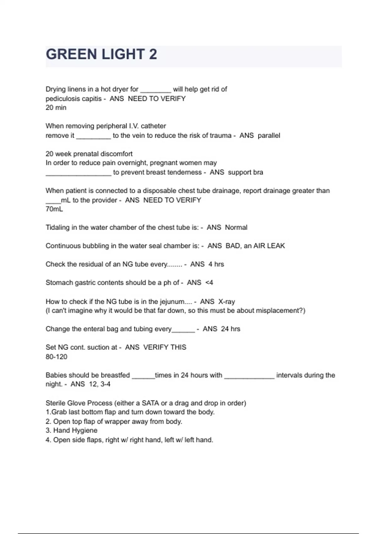 VATI PN Comprehensive Predictor 2023 Form A Green Light Exam Questions and Answers (Verified Answers) Drying linens in a hot dryer for ________ will help get rid of pediculosis capitis - ANS NEED TO VERIFY 20 min When removing peripheral I.V. catheter remove it _________ to the vein to reduce the risk of trauma - ANS parallel 20 week prenatal discomfort In order to reduce pain overnight, pregnant women may _________________ to prevent breast tenderness - ANS support bra When patient is connected to a disposable chest tube drainage, report drainage greater than ____mL to the provider - ANS NEED TO VERIFY 70mL Tidaling in the water chamber of the chest tube is: - ANS Normal Continuous bubbling in the water seal chamber is: - ANS BAD, an AIR LEAK Check the residual of an NG tube every........ - ANS 4 hrs Stomach gastric contents should be a ph of - ANS <4 How to check if the NG tube is in the jejunum.... - ANS X-ray (I can't imagine why it would be that far down, so this must be about misplacement?) Change the enteral bag and tubing every______ - ANS 24 hrs Set NG cont. suction at - ANS VERIFY THIS 80-120 Babies should be breastfed ______times in 24 hours with _____________ intervals during the night. - ANS 12, 3-4 Sterile Glove Process (either a SATA or a drag and drop in order) 1.Grab last bottom flap and turn down toward the body. 2. Open top flap of wrapper away from body. 3. Hand Hygiene 4. Open side flaps, right w/ right hand, left w/ left hand. 5. Don gloves once the sterile field is set up with sterile instruments and tools opened. - ANS 3. Hand Hygiene 2. Open top flap of wrapper away from body. 4. Open side flaps, right w/ right hand, left w/ left hand. 1.Grab last bottom flap and turn down toward the body. 5. Don gloves once the sterile field is set up with sterile instruments and tools opened. When applying sterile gloves apply the_______________ glove first. - ANS Dominant Cherry angiomas are _________________ and actinic keratosis are ______________ - ANS expected aging skin changes, pre-malignant lesions Postoperative mastectomy teaching: Client should anticipate _________ avoid raising the ________________until drains are removed, plan to return to work in ________________ may resume driving in ______________ - ANS multiple drains, elbow above shoulder, 4-6 weeks, 7-10 days A COPD patient experiencing an EXACERBATION should be placed on O2 using ________________________- - ANS a venturi mask IS THIS CORRECT? A patient with rhinorrhea after exposure to your gloves may _______________ - ANS indicate a laytex allergy If a baby fails a physical assessment (hearing), they will be retested in ___________ - ANS 3 months An irregular rate with P waves, bizarre and variable QRS - ANS V- Fib After venous stripping and ligation perform ____________________, __________________________, ambulate ______________ every hour first ______________. patient's legs should be wrapped with _____________________postoperatively - ANS ROM for venous return, elevate feet, 5-10min, 24hr, an elastic bandage Ferrous sulfate elixir teaching: (possible SATA) After taking the pt should _________ may take during __________________ dark stools are ______________ increase daily ___________________ - ANS rinse mouth, pregnancy, expected, fiber the nurse is providing postmortem care - what is the first action? - ANS Check with family about religious practices Appendicitis pain location: - ANS Right lower quadrant I always remember I am always looking for the Right nursing App.