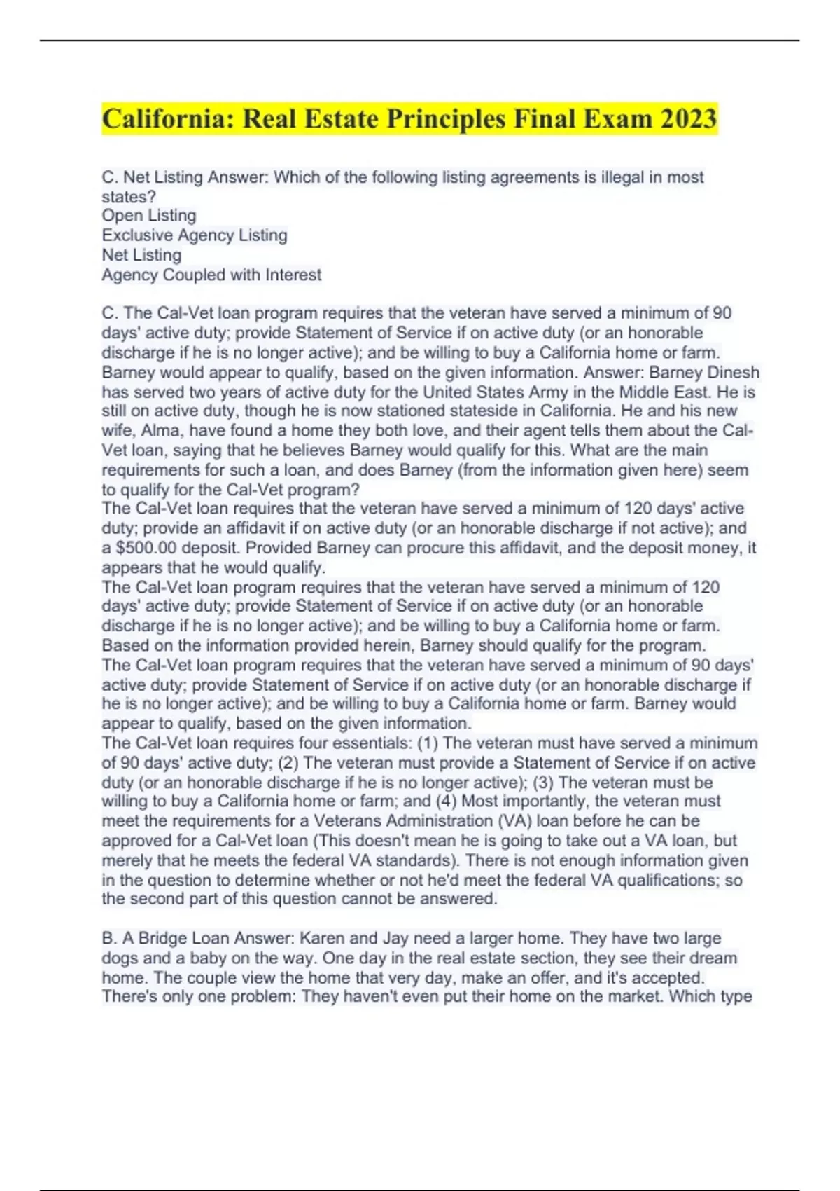C. Net Listing Answer: Which of the following listing agreements is illegal in most states?