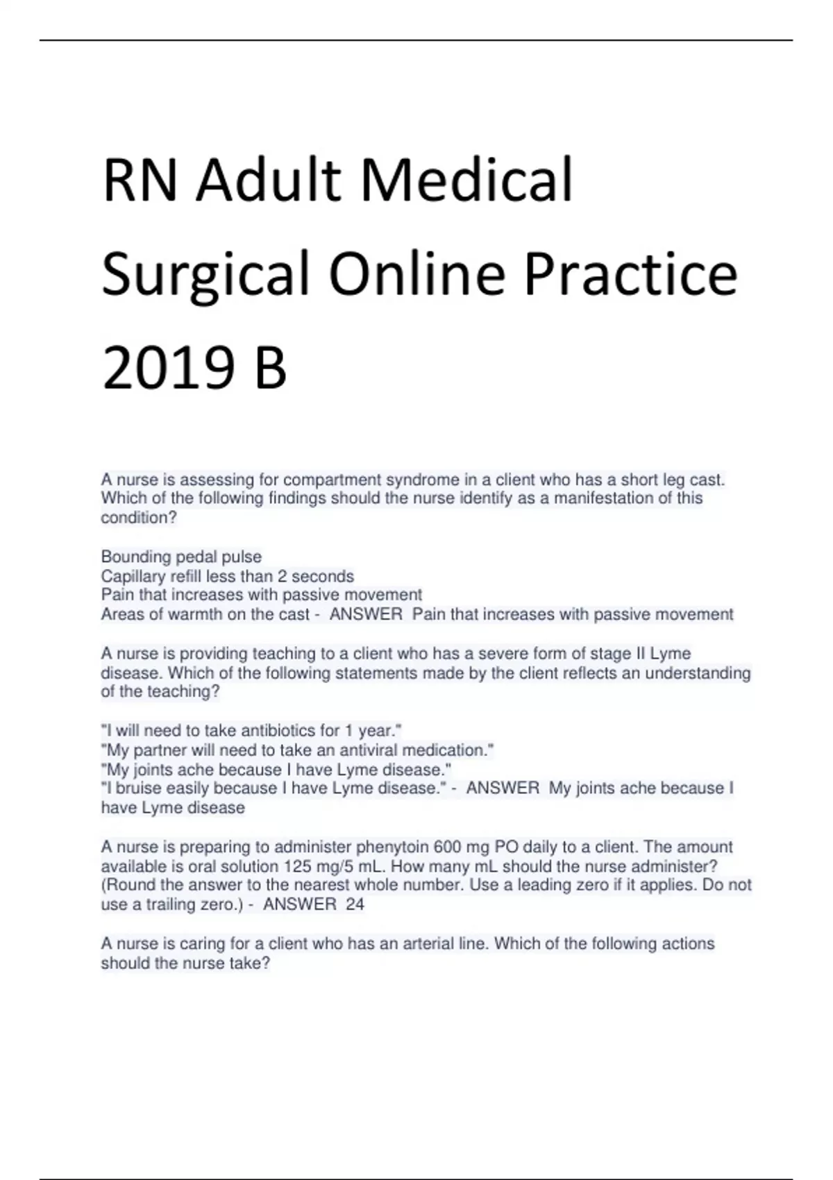 RN Adult Medical Surgical Online Practice 2019 B A nurse is assessing for compartment syndrome in a client who has a short leg cast. Which of the following findings should the nurse identify as a manifestation of this condition? Bounding pedal pulse Capillary refill less than 2 seconds Pain that increases with passive movement Areas of warmth on the cast - ANSWER Pain that increases with passive movement A nurse is providing teaching to a client who has a severe form of stage II Lyme disease. Which of the following statements made by the client reflects an understanding of the teaching? "I will need to take antibiotics for 1 year." "My partner will need to take an antiviral medication." "My joints ache because I have Lyme disease." "I bruise easily because I have Lyme disease." - ANSWER My joints ache because I have Lyme disease A nurse is preparing to administer phenytoin 600 mg PO daily to a client. The amount available is oral solution 125 mg/5 mL. How many mL should the nurse administer? (Round the answer to the nearest whole number. Use a leading zero if it applies. Do not use a trailing zero.) - ANSWER 24 A nurse is caring for a client who has an arterial line. Which of the following actions should the nurse take? Flush the line before administering antibiotics Position the client in Trendelenburg to obtain measurements. Have the client bear down when readings are obtained. Place a pressure bag around the flush solution. - ANSWER place a pressure bag around the flush solution A nurse is updating the plan of care for a client who is receiving chemotherapy. Which of the following findings should the nurse identify as the priority? Report of sore throat Report of memory loss Alopecia Mucositis - ANSWER Report of sore throat A nurse is reviewing the medical record of a client who has systemic lupus erythematosus (SLE). Which of the following findings should the nurse expect? Facial butterfly rash Bradycardia Esophagitis Interstitial fibrosis - ANSWER Facial butterfly rash A nurse is planning care for a client who is postoperative following a parathyroidectomy. Which of the following actions should the nurse identify as the priority? Use pillows to support the client's head and neck. Offer opioid medication. Place a tracheostomy tray at the bedside. Place the client in semi-Fowler's position. - ANSWER Place tach tray at the bedside A nurse is assessing a client who has diabetes insipidus. Which of the following findings should the nurse expect? Low urine specific gravity Hypertension Bounding peripheral pulses Hyperglycemia - ANSWER Low urine specific gravity A nurse is providing teaching to a client who has stage II cervical cancer and is scheduled for brachytherapy. Which of the following instructions should the nurse include? "You will have an implant placed twice each month for the duration of the treatment." "You should remain at least 6 feet away from others between treatments." "You should expect to have blood in your urine for a few days after treatment." "You will need to stay still in the bed during each treatment session." - ANSWER You will need to stay still in the bed during each treatment session." A nurse is planning care for a client who is scheduled for a thoracentesis. Which of the following interventions should the nurse include in the plan? Encourage the client to take deep breaths after the procedure. Assist the client to hold their arms up during the procedure. Instruct the client to remain NPO after midnight prior to the procedure. Keep the client on bed rest for 8 hr following the procedure.a - ANSWER Encourage the client to take deep breaths after the procedure A nurse is caring for a client who is receiving a blood transfusion. The client becomes restless, dyspneic, and has crackles noted to the lung bases. Which of the following actions should the nurse anticipate taking? Administer an antihistamine. Slow the infusion rate. Give the client a corticosteroid. Elevate the client's lower extremities. - ANSWER Slow the infusion rate A nurse is providing teaching to a client who has end-stage kidney disease and is waiting for a kidney transplant. Which of the following information should the nurse provide? Kidney donation must come from a living donor. Immunosuppressive therapy is necessary until the donated kidney begins producing urine. Hemodialysis is sometimes required following surgery. Kidney transplant recipients can resume their regular diet following surgery. - ANSWER Hemodialys is something required following surgery A nurse is caring for a client who has hypothyroidism. Which of the following manifestations should the nurse expect? Constipation tachycardia diaphoresis insomnia - ANSWER Constipation A nurse is providing preoperative teaching for a client who is scheduled for a mastectomy. Which of the following statements should the nurse make? "You should accept your body image change before discharge." "It is important for you to look at the incisional site when the dressings are removed." "I will refer you to community resources that can provide support."
