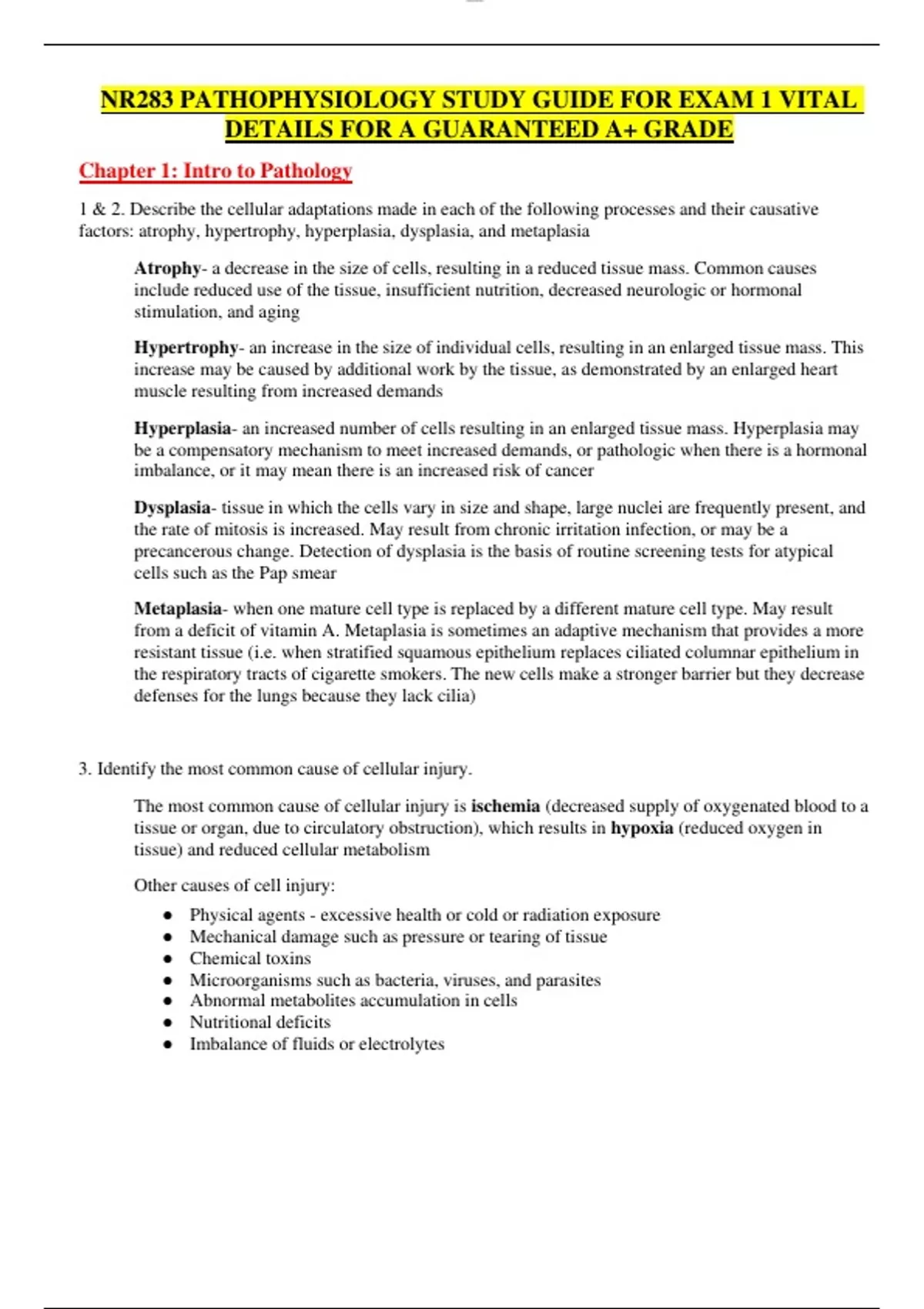 Summary NR283 PATHOPHYSIOLOGY STUDY GUIDE FOR EXAM 1 VITAL DETAILS FOR A GUARANTEED A+ GRADE