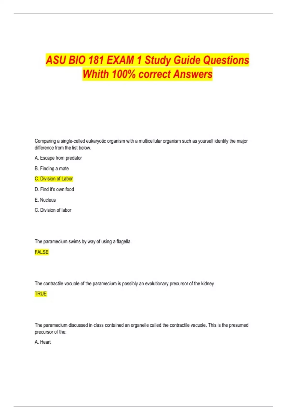 ASU BIO 181 EXAM 1 Study Guide Questions 100% correct Answers