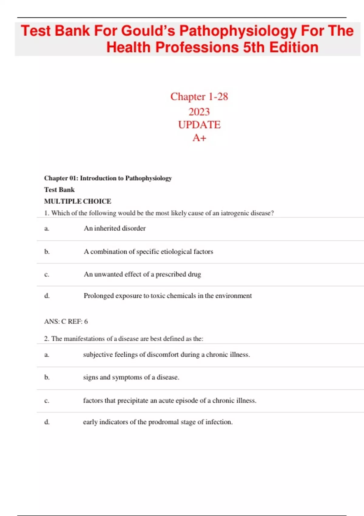 Chapter 01: Introduction to Pathophysiology Test Bank MULTIPLE CHOICE 1. Which of the following would be the most likely cause of an iatrogenic disease? a. An inherited disorder b. A combination of specific etiological factors c. An unwanted effect of a prescribed drug d. Prolonged exposure to toxic chemicals in the environment ANS: C REF: 6 2. The manifestations of a disease are best defined as the: a. subjective feelings of discomfort during a chronic illness. b. signs and symptoms of a disease. c. factors that precipitate an acute episode of a chronic illness. d. early indicators of the prodromal stage of infection. Test Bank For Gould’s Pathophysiology For The Health Professions 5th Edition ANS: B REF: 6 3. The best definition of the term prognosis is the: a. precipitating factors causing an acute episode. b. number of remissions to be expected during the course of a chronic illness. c. predicted outcome or likelihood of recovery from a specific disease. d. exacerbations occurring during chronic illness. ANS: C REF: 7 4. Which of the following is considered a systemic sign of disease? a. Swelling of the knee b. Fever c. Pain in the neck d. Red rash on the face ANS: B REF: 6 5. Etiology is defined as the study of the: a. causes of a disease. b. course of a disease. c. expected complications of a disease. d. manifestations of a disease. ANS: A REF: 5 6. A type of cellular adaptation in which there is a decrease in cell size is referred to as: a. hypertrophy. b. metaplasia. c. anaplasia. d. atrophy. ANS: D REF: 8 7. A change in a tissue marked by cells that vary in size and shape and show increased mitotic figures would be called: ANS: C REF: 8 8. A deficit of oxygen in the cells usually due to respiratory or circulatory problems is called: a. apoptosis. b. ischemia. c. hypertrophy. d. necrosis. ANS: B REF: 9 9. When a group of cells in the body dies, the change is called: a. ischemia. b. gangrene. a. metaplasia. b. atrophy. c. dysplasia. d. hypertrophy. c. hypoxia. d. necrosis. ANS: D REF: 10 10. Rigorous weight lifting/body building regimens may result in the skeletal muscle cells undergoing: ANS: A REF: 8 11. The term cancer refers to: a. dysplasia. b. hyperplasia. c. metaplasia. d. malignant neoplasm. ANS: D REF: 9 12. To which of the following does the term apoptosis refer? a. Increased rate of mitosis by certain cells b. Ischemic damage to cells a. hypertrophy. b. dysplasia. c. atrophy. d. regeneration. c. Liquefaction of necrotic tissue d. Preprogrammed cell self-destruction ANS: D REF: 9 13. Which of the following statements is TRUE?... CONTINUES...