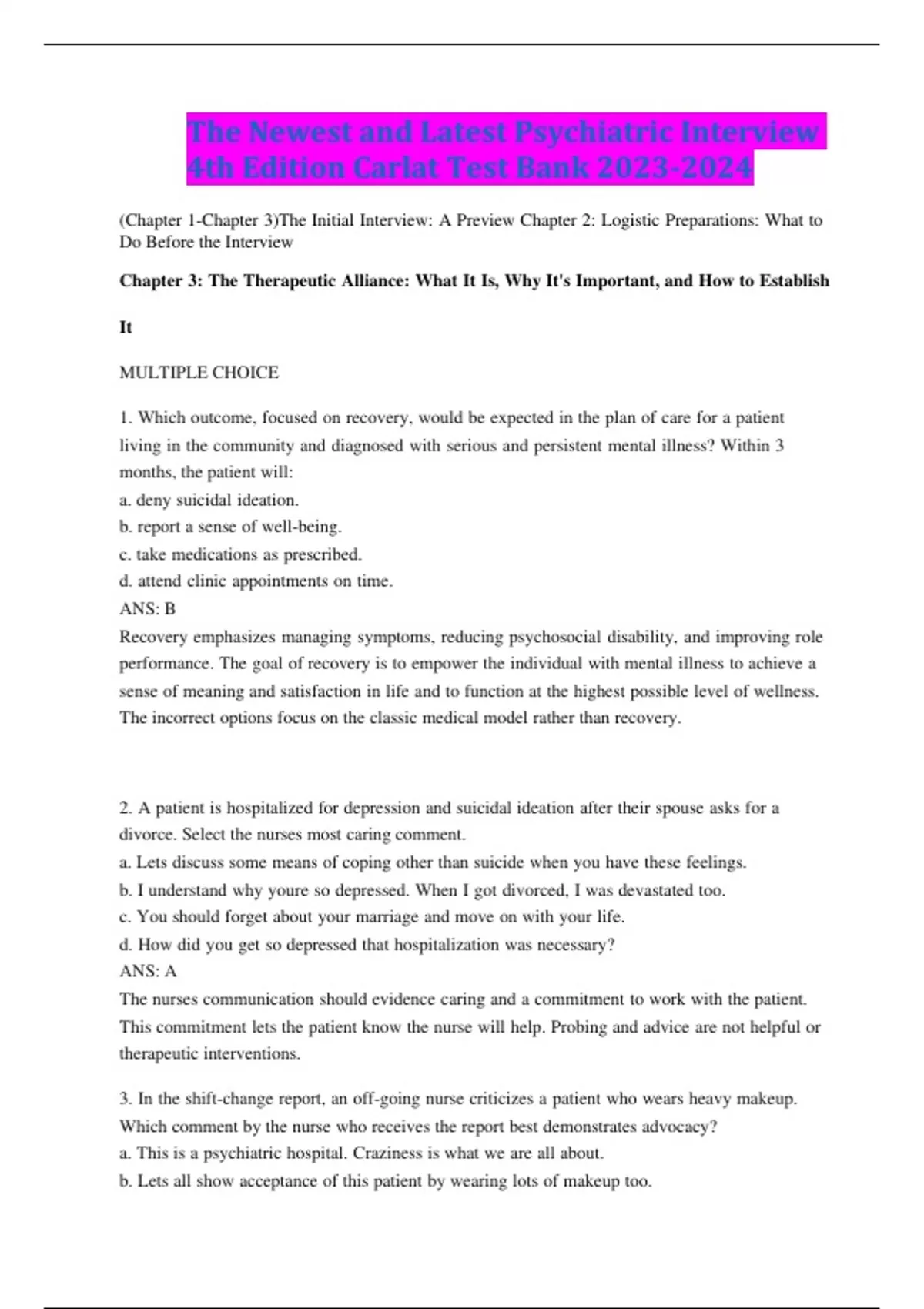 The Newest and Latest Psychiatric Interview 4th Edition Carlat Test Bank . Which outcome, focused on recovery, would be expected in the plan of care for a patient living in the community and diagnosed with serious and persistent mental illness? Within 3 months, the patient will: a. deny suicidal ideation. b. report a sense of well-being. c. take medications as prescribed. d. attend clinic appointments on time. ANS: B Recovery emphasizes managing symptoms, reducing psychosocial disability, and improving role performance. The goal of recovery is to empower the individual with mental illness to achieve a sense of meaning and satisfaction in life and to function at the highest possible level of wellness. The incorrect options focus on the classic medical model rather than recovery. 2. A patient is hospitalized for depression and suicidal ideation after their spouse asks for a divorce. Select the nurses most caring comment. a. Lets discuss some means of coping other than suicide when you have these feelings. b. I understand why youre so depressed. When I got divorced, I was devastated too. c. You should forget about your marriage and move on with your life. d. How did you get so depressed that hospitalization was necessary? ANS: A The nurses communication should evidence caring and a commitment to work with the patient. This commitment lets the patient know the nurse will help. Probing and advice are not helpful or therapeutic interventions. 3. In the shift-change report, an off-going nurse criticizes a patient who wears heavy makeup. Which comment by the nurse who receives the report best demonstrates advocacy? a. This is a psychiatric hospital. Craziness is what we are all about. b. Lets all show acceptance of this patient by wearing lots of makeup too. c. Your comments are inconsiderate and inappropriate. Keep the report objective. d. Our patients need our help to learn behaviors that will help them get along in society. ANS: D