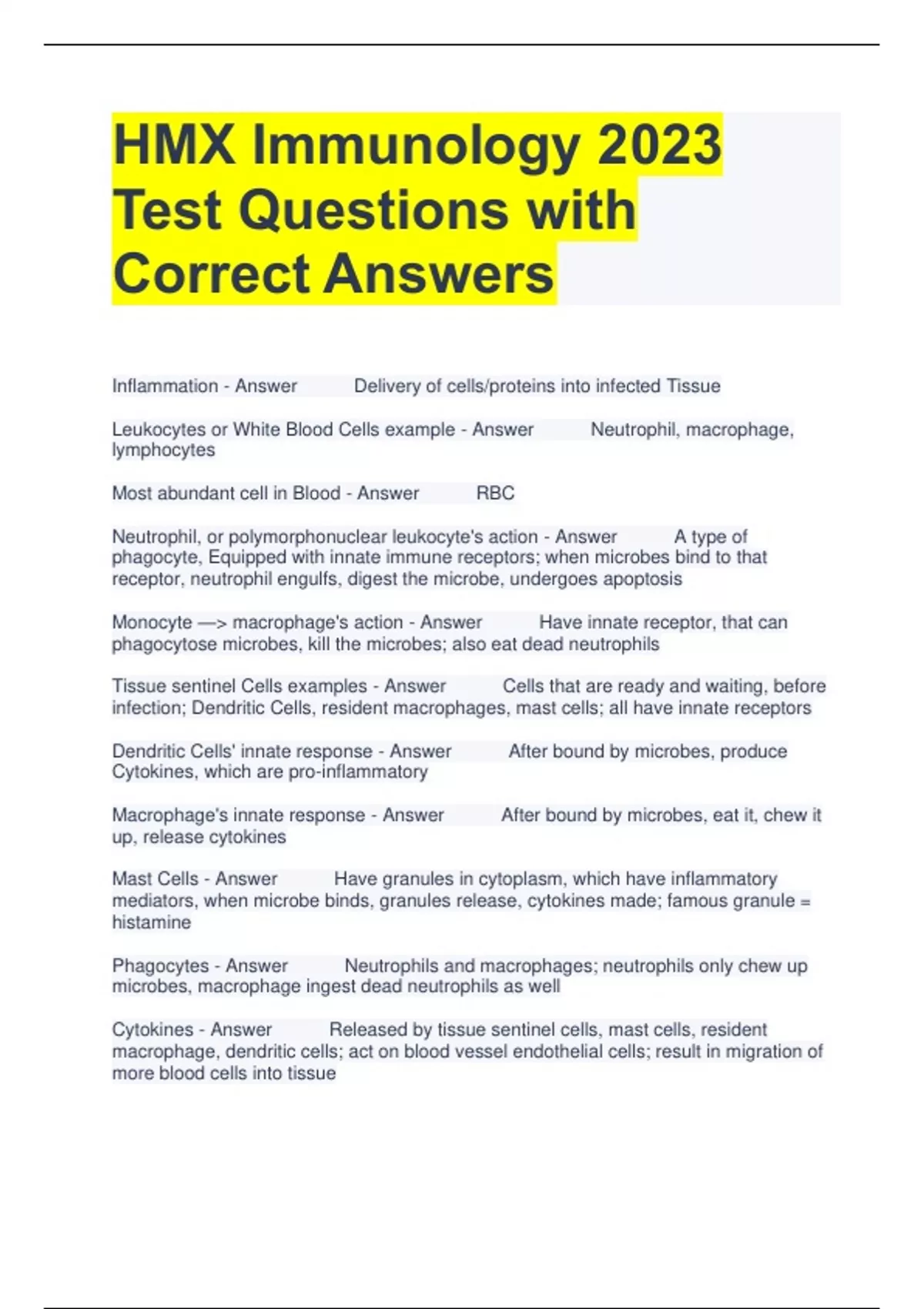 HMX Immunology Practice Test Questions with Complete Solutions ABO blood groups - Answer carbohydrate antigens on the surface of blood cells determine blood type primary lymphoid organs - Answer bone marrow and thymus circulating leukocytes - Answer mature immune cells that circulate through blood vessels innate immunity - Answer mechanisms that exist prior to infection and are capable of rapid responses to microbes adaptive immunity - Answer a more complex defense system against infection that requires some time to develop after initial exposure to the microbe; is specific and specialized and has memory; mediated by lymphocytes with highly diverse antigen receptors lymphocytes - Answer a type of white blood cell that makes antibodies to fight off infections PD-L1 - Answer A protein that's expressed by immune cells, such as DCs, and non-immune cells, including many cancer cells. Blocking this protein prevents its interaction with PD-1 expressed by T cells, thus relieving a negative regulator of T cell function Checkpoint blockade - Answer the reactivation of existing T cells that are nonfunctional due to inhibitory signaling; accomplished by blocking inhibitory receptors, which rejuvenates exhausted T cells (mainly CTLA-4 in lymph nodes and PD-1 in tissue) Chimeric antigen receptor (CAR) T cell - Answer are created by introducing into T cells a DNA sequence that contains the recognition portion of an antibody fused to signaling components of the T cell receptor; have been used to treat some types of cancer Cross matching - Answer method of matching a donor's blood to the recipient by mixing a sample in a test tube to determine compatibility HLA (human leukocyte antigen) - Answer these proteins are the most important determinants of an allogenic immune response HLA matching - Answer used to reduce the risk of transplant rejection Natural antibodies - Answer Antibodies produced by the immune system in the apparent absence of any infection. They have a broad specificity for self and microbial antigens, can react with many pathogens, and can activate complement.
