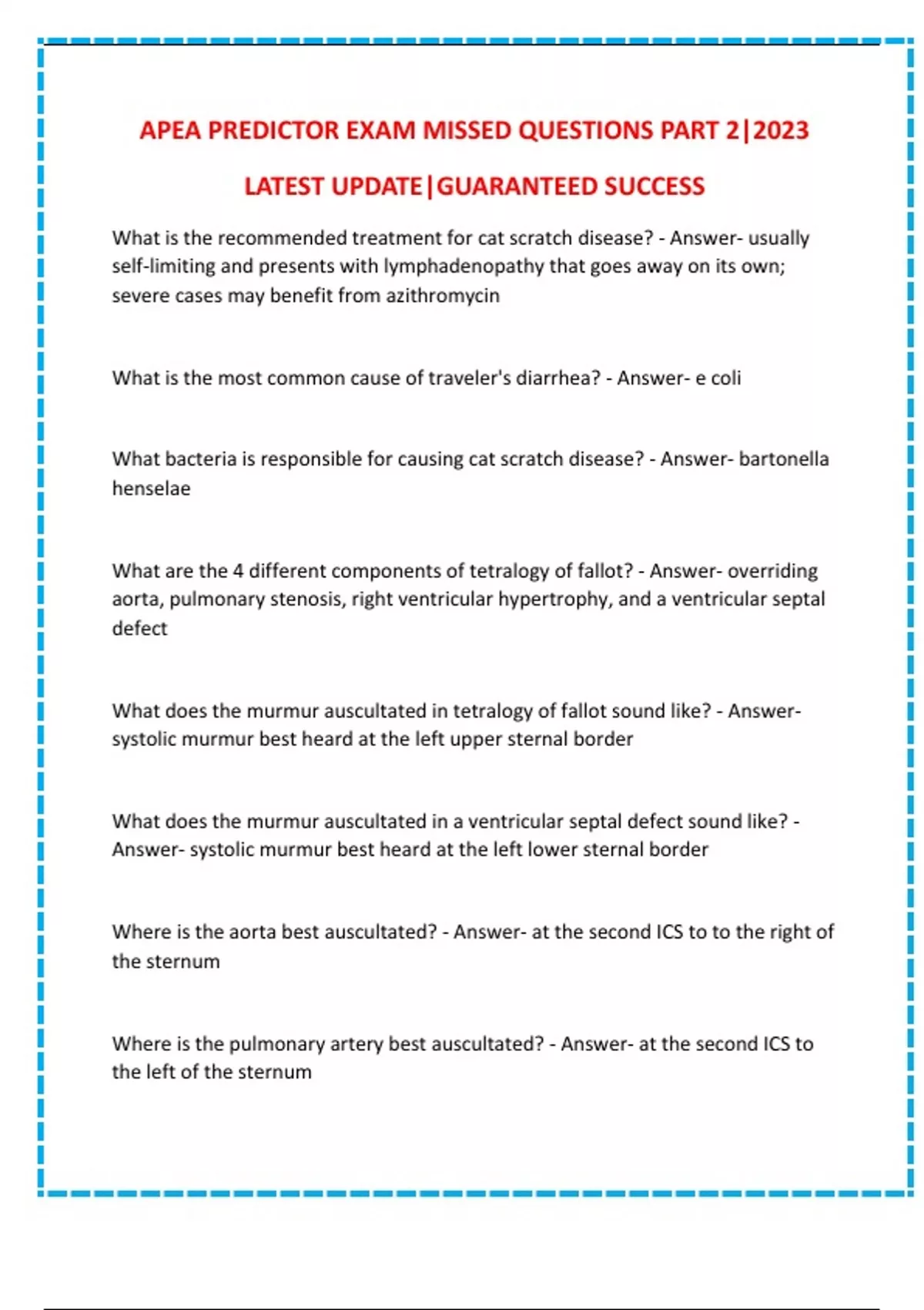 APEA PREDICTOR EXAM MISSED QUESTIONS PART 2|2023 LATEST UPDATE|GUARANTEED SUCCESS What is the recommended treatment for cat scratch disease? - Answer- usually self-limiting and presents with lymphadenopathy that goes away on its own; severe cases may benefit from azithromycin What is the most common cause of traveler's diarrhea? - Answer- e coli What bacteria is responsible for causing cat scratch disease? - Answer- bartonella henselae What are the 4 different components of tetralogy of fallot? - Answer- overriding aorta, pulmonary stenosis, right ventricular hypertrophy, and a ventricular septal defect What does the murmur auscultated in tetralogy of fallot sound like? - Answer- systolic murmur best heard at the left upper sternal border What does the murmur auscultated in a ventricular septal defect sound like? - Answer- systolic murmur best heard at the left lower sternal border Where is the aorta best auscultated? - Answer- at the second ICS to to the right of the sternum Where is the pulmonary artery best auscultated? - Answer- at the second ICS to the left of the sternum What is a scotoma? - Answer- a blind spot or aura that obstructs part of your vision Is presbyopia nearsightedness or farsightedness? - Answer- farsightedness meaning it can be harder to see things up close, such as reading a newspaper and may need to hold it farther away or use reading glasses Is myopia nearsightedness or farsightedness? - Answer- nearsightedness meaning it is hard to see things far away Do cataracts cause myopia or presbyopia? - Answer- myopia; meaning nearsightedness and they make things blurry that are farther away which is why driving at night becomes difficult