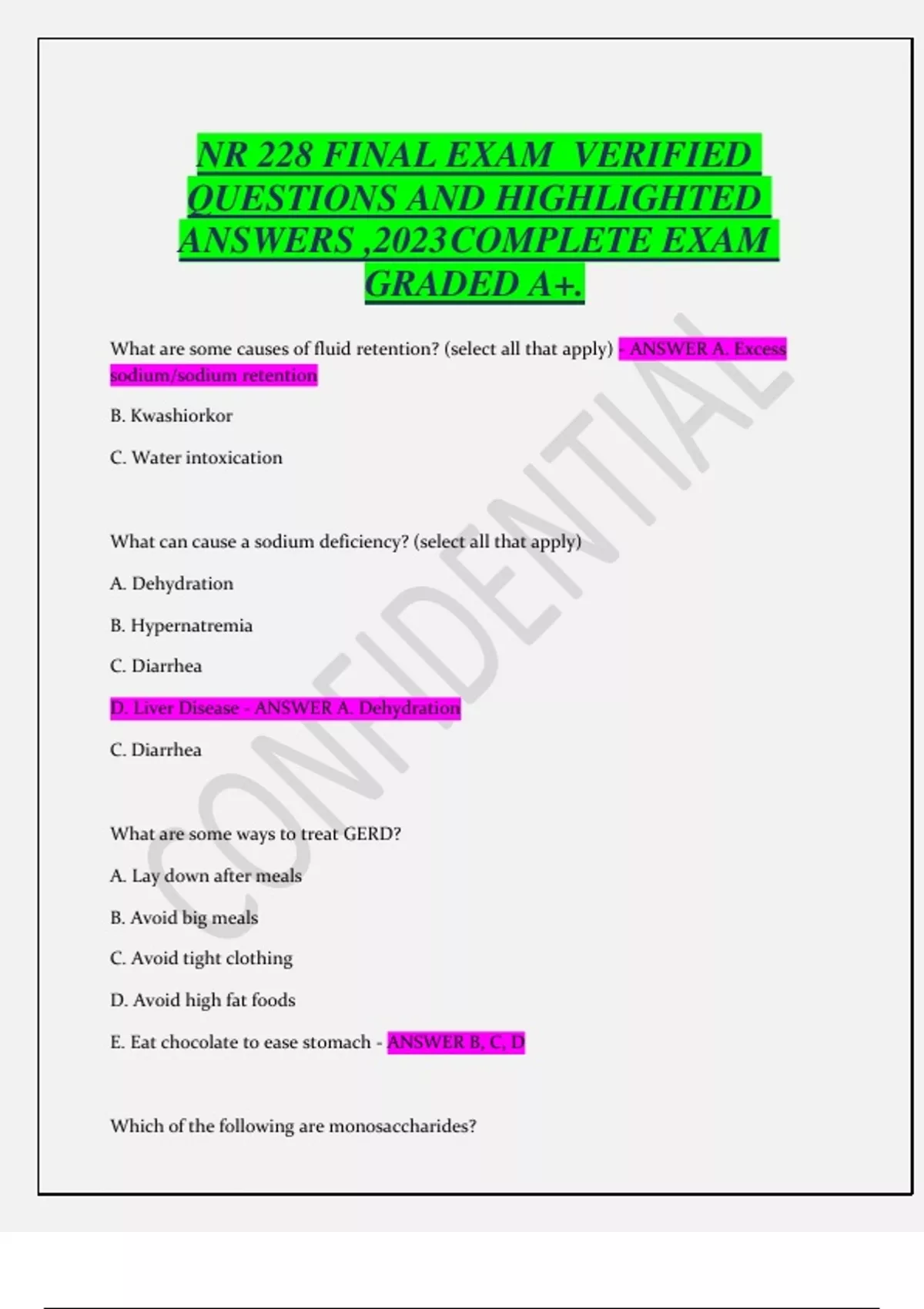 NR 228 FINAL EXAM VERIFIED QUESTIONS AND HIGHLIGHTED ANSWERS ,2023 COMPLETE EXAM GRADED A+. What are some causes of fluid retention? (select all that apply) - ANSWER A. Excess sodium/sodium retention B. Kwashiorkor C. Water intoxication What can cause a sodium deficiency? (select all that apply) A. Dehydration B. Hypernatremia C. Diarrhea D. Liver Disease - ANSWER A. Dehydration C. Diarrhea What are some ways to treat GERD? A. Lay down after meals B. Avoid big meals C. Avoid tight clothing D. Avoid high fat foods E. Eat chocolate to ease stomach - ANSWER B, C, D Which of the following are monosaccharides? A. Glucose B. Sucruose C. Fructose