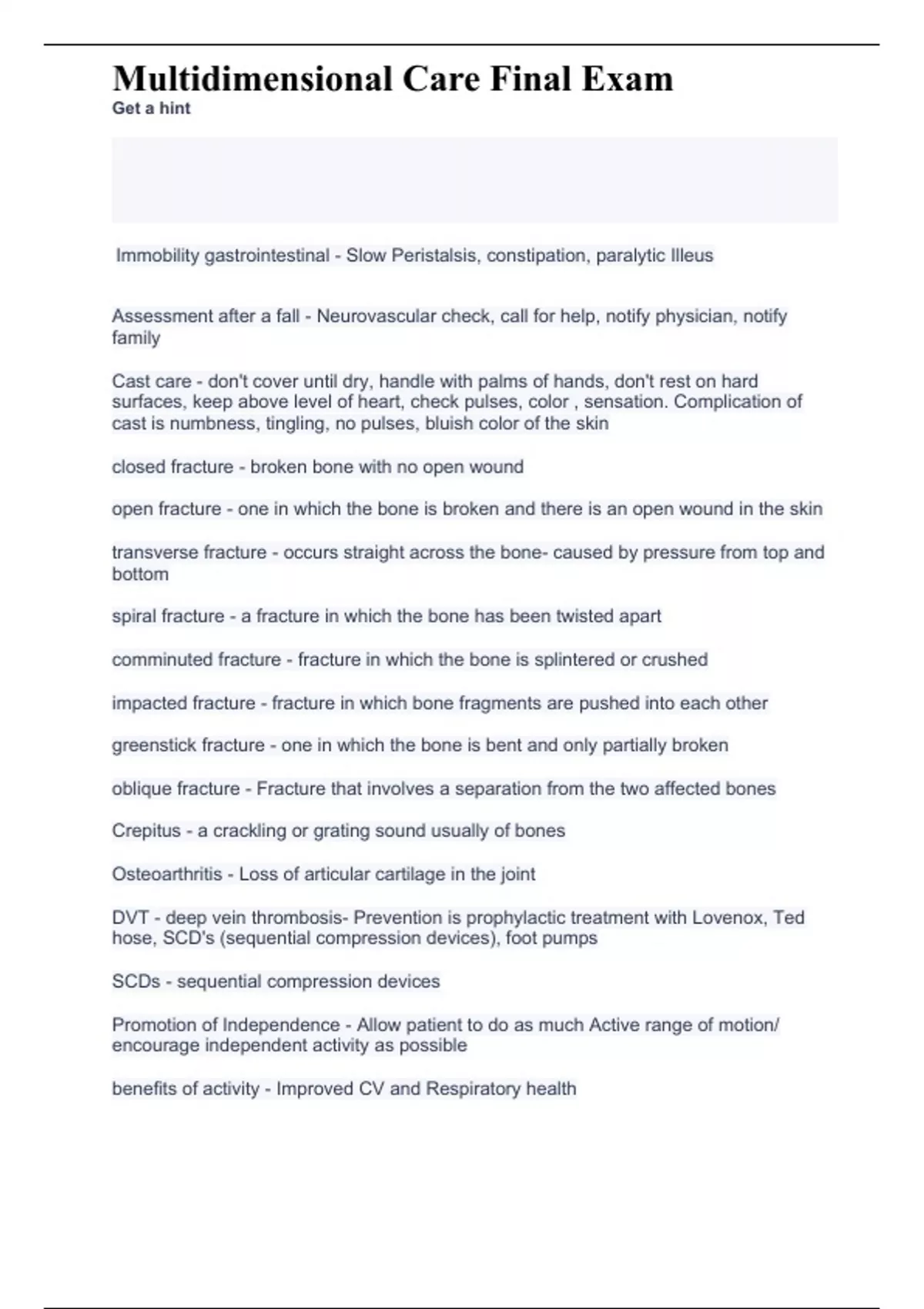 Immobility gastrointestinal - Slow Peristalsis, constipation, paralytic Illeus Assessment after a fall - Neurovascular check, call for help, notify physician, notify family Cast care - don't cover until dry, handle with palms of hands, don't rest