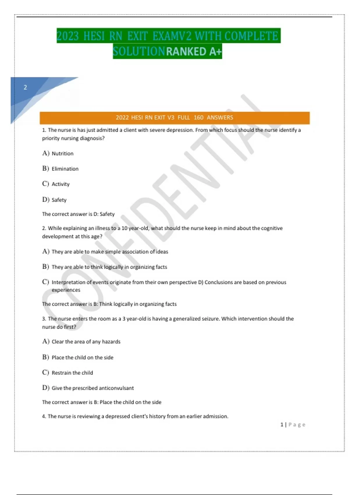 1. The nurse is has just admitted a client with severe depression. From which focus should the nurse identify a priority nursing diagnosis? A) Nutrition B) Elimination C) Activity D) Safety The correct answer is D: Safety 2. While explaining an illness to a 10 year-old, what should the nurse keep in mind about the cognitive development at this age? A) They are able to make simple association of ideas B) They are able to think logically in organizing facts C) Interpretation of events originate from their own perspective D) Conclusions are based on previous experiences The correct answer is B: Think logically in organizing facts 3. The nurse enters the room as a 3 year-old is having a generalized seizure. Which intervention should the nurse do first? A) Clear the area of any hazards B) Place the child on the side C) Restrain the child D) Give the prescribed anticonvulsant The correct answer is B: Place the child on the side
