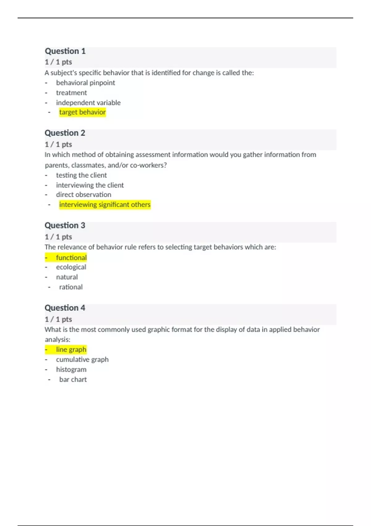 Question 1 1 / 1 pts A subject's specific behavior that is identified for change is called the: - behavioral pinpoint - treatment - independent variable - target behavior Question 2 1 / 1 pts In which method of obtaining assessment information would you gather information from parents, classmates, and/or co-workers? - testing the client - interviewing the client - direct observation - interviewing significant others Question 3 1 / 1 pts The relevance of behavior rule refers to selecting target behaviors which are: - functional - ecological