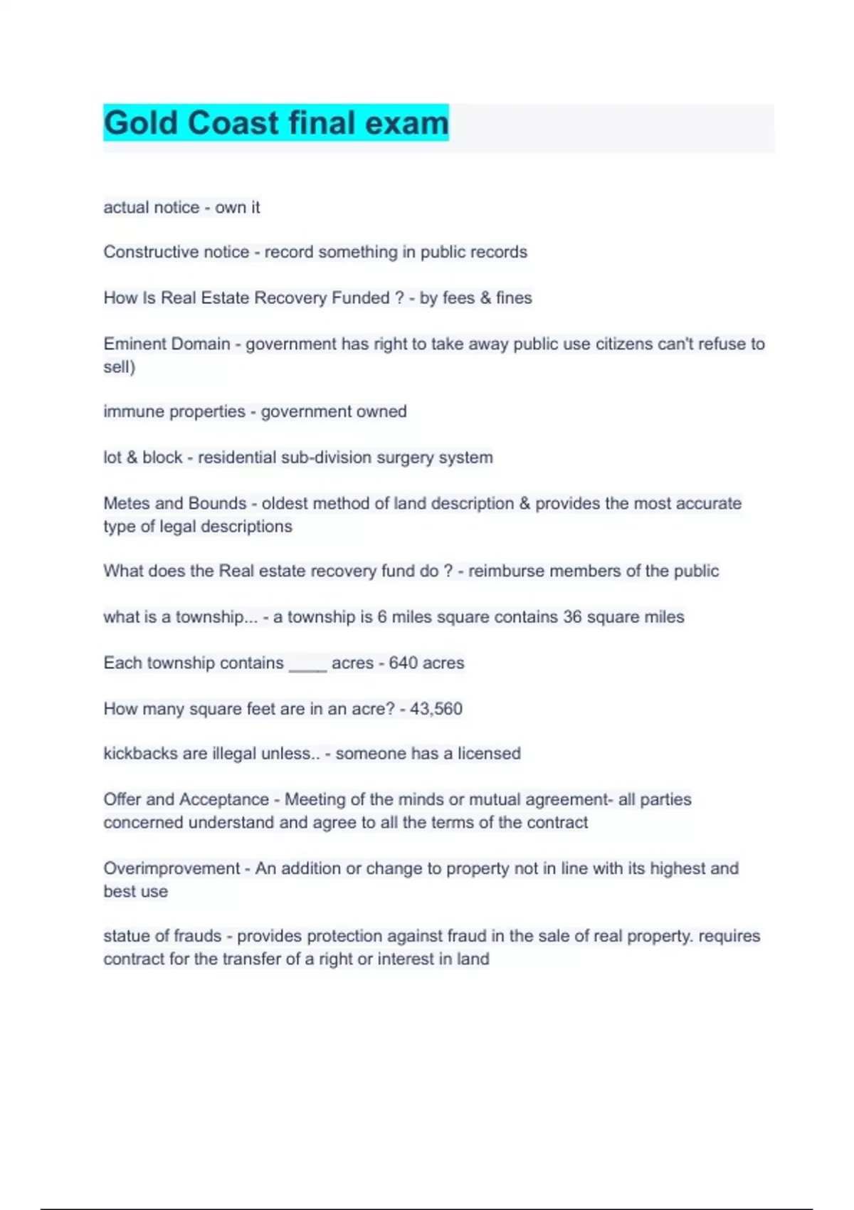 Gold Coast final exam 2023 full solution/verified correct answers 100% actual notice - own it Constructive notice - record something in public records How Is Real Estate Recovery Funded ? - by fees & fines Eminent Domain - government has right to take away public use citizens can't refuse to sell) immune properties - government owned lot & block - residential sub-division surgery system