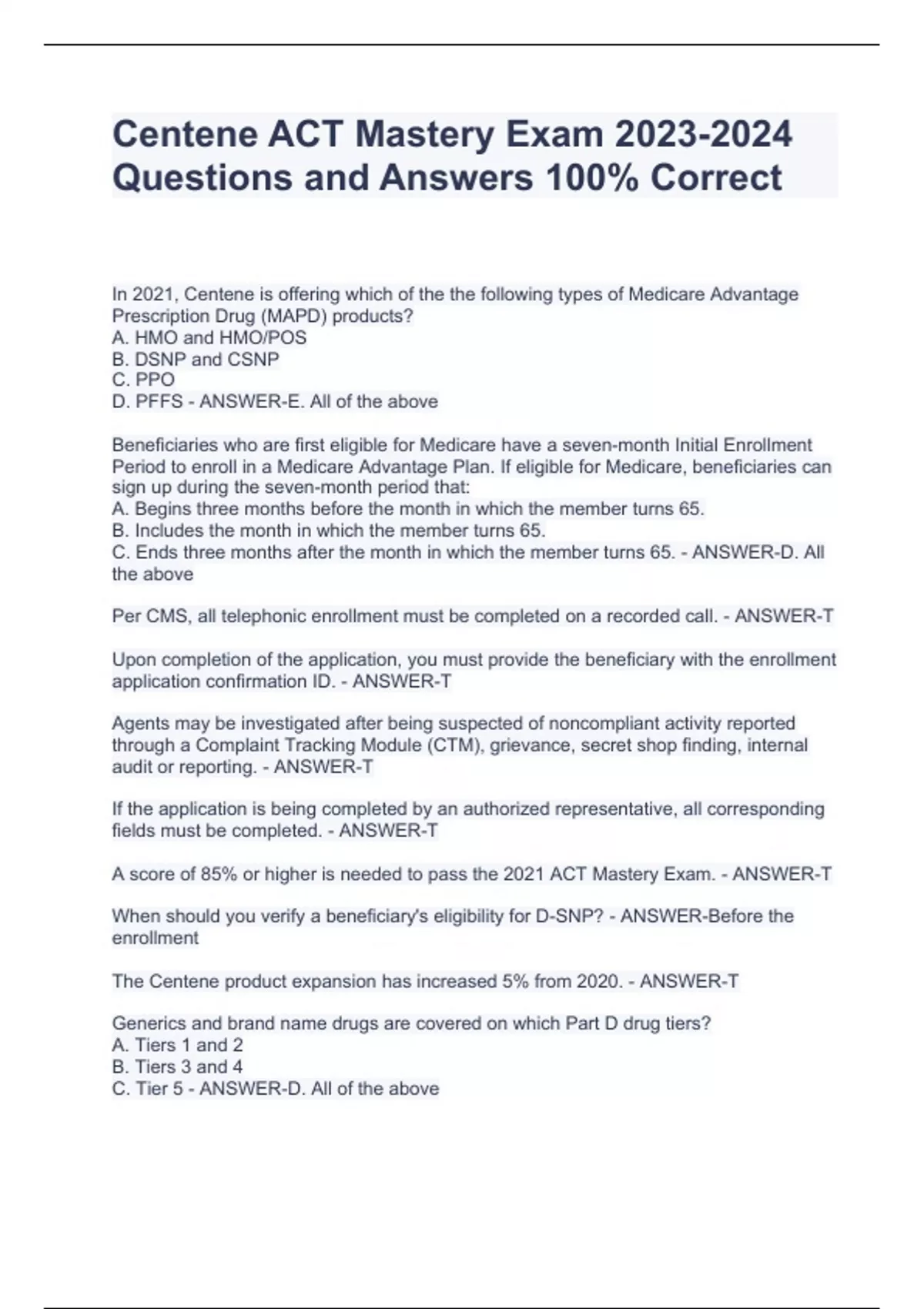 Centene ACT Mastery Exam Questions and Answers 100% Correct Centene ACT Mastery Exam Questions and Answers 100% Correct Centene ACT Mastery Exam Questions and Answers 100% Correct In 2021, Centene is offering which of the the following types of Medicare Advantage Prescription Drug (MAPD) products? A. HMO and HMO/POS B. DSNP and CSNP C. PPO D. PFFS - ANSWER-E. All of the above Beneficiaries who are first eligible for Medicare have a seven-month Initial Enrollment Period to enroll in a Medicare Advantage Plan. If eligible for Medicare, beneficiaries can sign up during the seven-month period that: A. Begins three months before the month in which the member turns 65. B. Includes the month in which the member turns 65. C. Ends three months after the month in which the member turns 65. - ANSWER-D. All the above Per CMS, all telephonic enrollment must be completed on a recorded call. - ANSWER-T Upon completion of the application, you must provide the beneficiary with the enrollment application confirmation ID. - ANSWER-T Agents may be investigated after being suspected of noncompliant activity reported through a Complaint Tracking Module (CTM), grievance, secret shop finding, internal