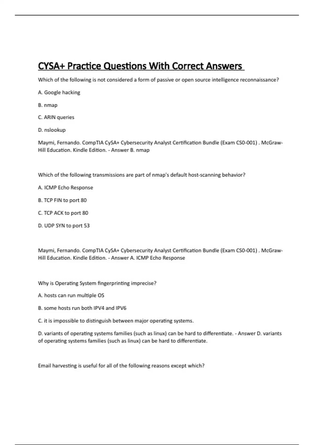 Which of the following is not considered a form of passive or open source intelligence reconnaissance? A. Google hacking B. nmap C. ARIN queries D. nslookup Maymi, Fernando. CompTIA CySA+ Cybersecurity Analyst Certification Bundle (Exam CS0-001) . McGraw-Hill Education. Kindle Edition. - Answer B. nmap Which of the following transmissions are part of nmap's default host-scanning behavior? A. ICMP Echo Response B. TCP FIN to port 80 C. TCP ACK to port 80 D. UDP SYN to port 53 Maymi, Fernando. CompTIA CySA+ Cybersecurity Analyst Certification Bundle (Exam CS0-001) . McGraw-Hill Education. Kindle Edition. - Answer A. ICMP Echo Response Why is Operating System fingerprinting imprecise? A. hosts can run multiple OS B. some hosts run both IPV4 and IPV6 C. it is impossible to distinguish between major operating systems. D. variants of operating systems families (such as linux) can be hard to differentiate. - Answer D. variants of operating systems families (such as linux) can be hard to differentiate. Email harvesting is useful for all of the following reasons except which? A. the inbox name is commonly the same as an active user account name. B. Publicly visible addresses are likelier to receive phishing emails C. email addresses can help yield additional personal information for targeting. D. It is difficult to find email addresses for specific individuals or organizations - Answer D. It is difficult to find email addresses for specific individuals or organizations