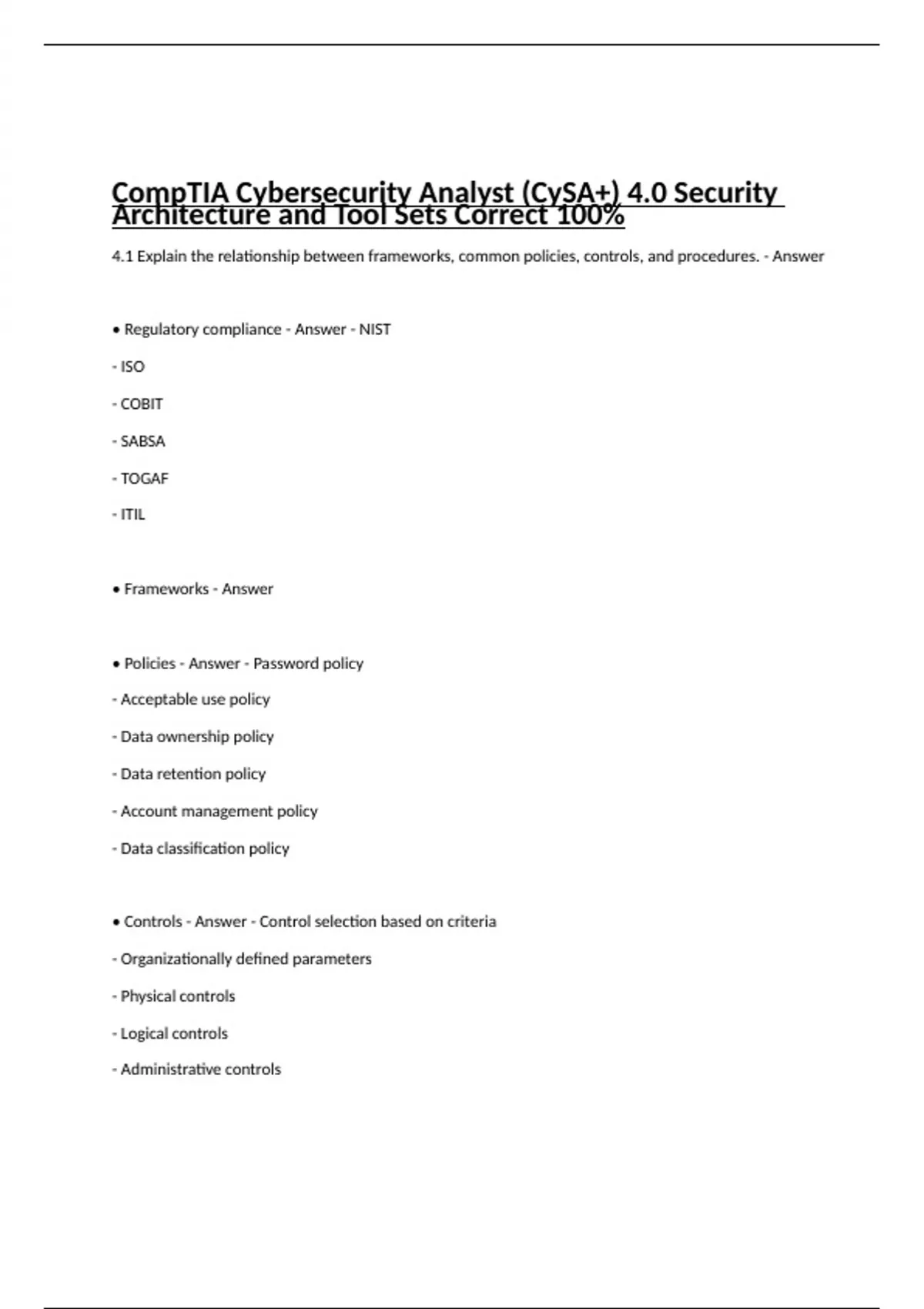 CompTIA Cybersecurity Analyst (CySA+) 4.0 Security Architecture and Tool Sets Correct 100%