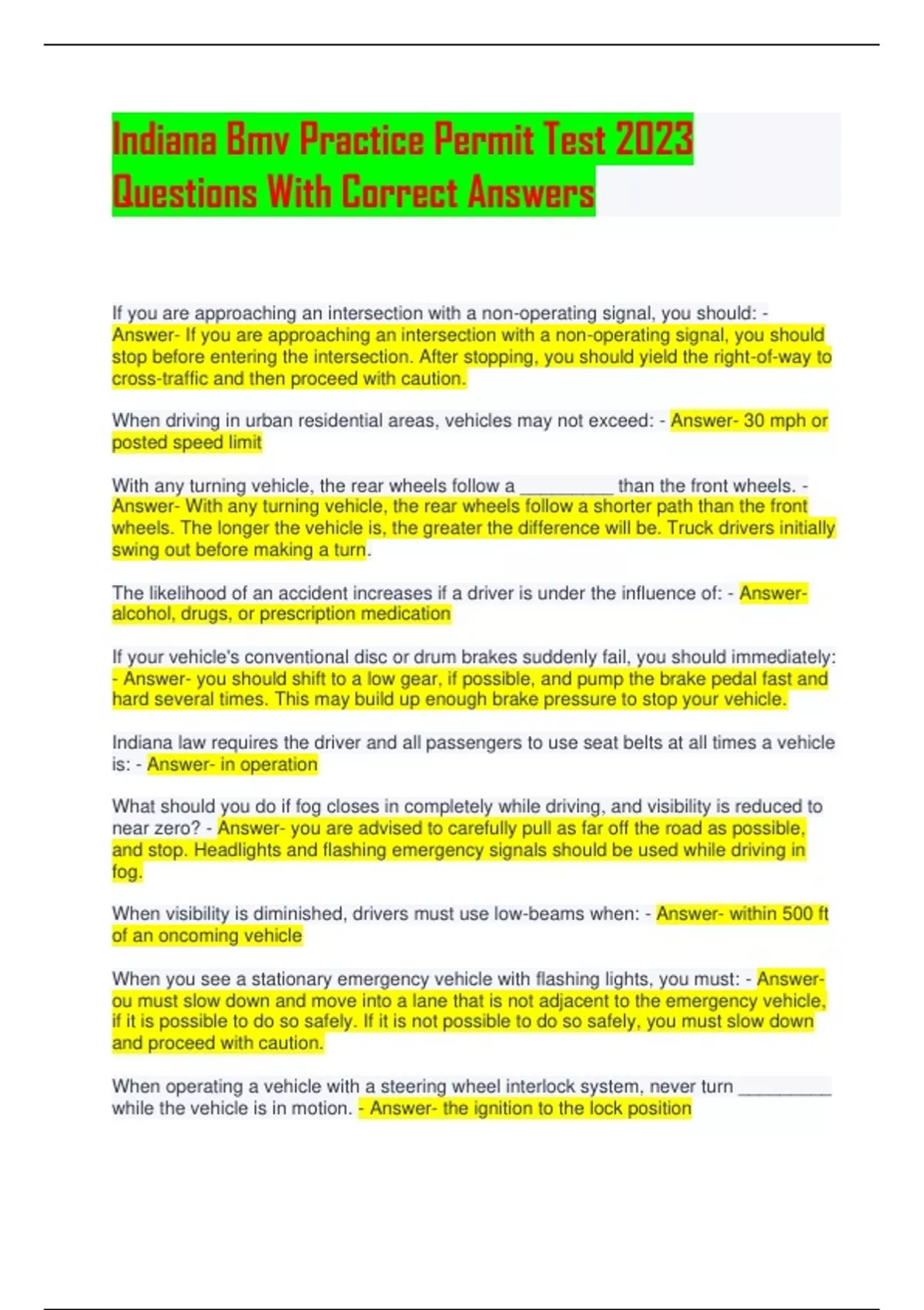 Indiana Bmv Practice Permit Test 2023 Questions With Correct Answers If you are approaching an intersection with a non-operating signal, you should: - Answer- If you are approaching an intersection with a non-operating signal, you should stop before entering the intersection. After stopping, you should yield the right-of-way to cross-traffic and then proceed with caution. When driving in urban residential areas, vehicles may not exceed: - Answer- 30 mph or posted speed limit With any turning vehicle, the rear wheels follow a _________ than the front wheels. - Answer- With any turning vehicle, the rear wheels follow a shorter path than the front wheels. The longer the vehicle is, the greater the difference will be. Truck drivers initially swing out before making a turn. The likelihood of an accident increases if a driver is under the influence of: - Answeralcohol, drugs, or prescription m