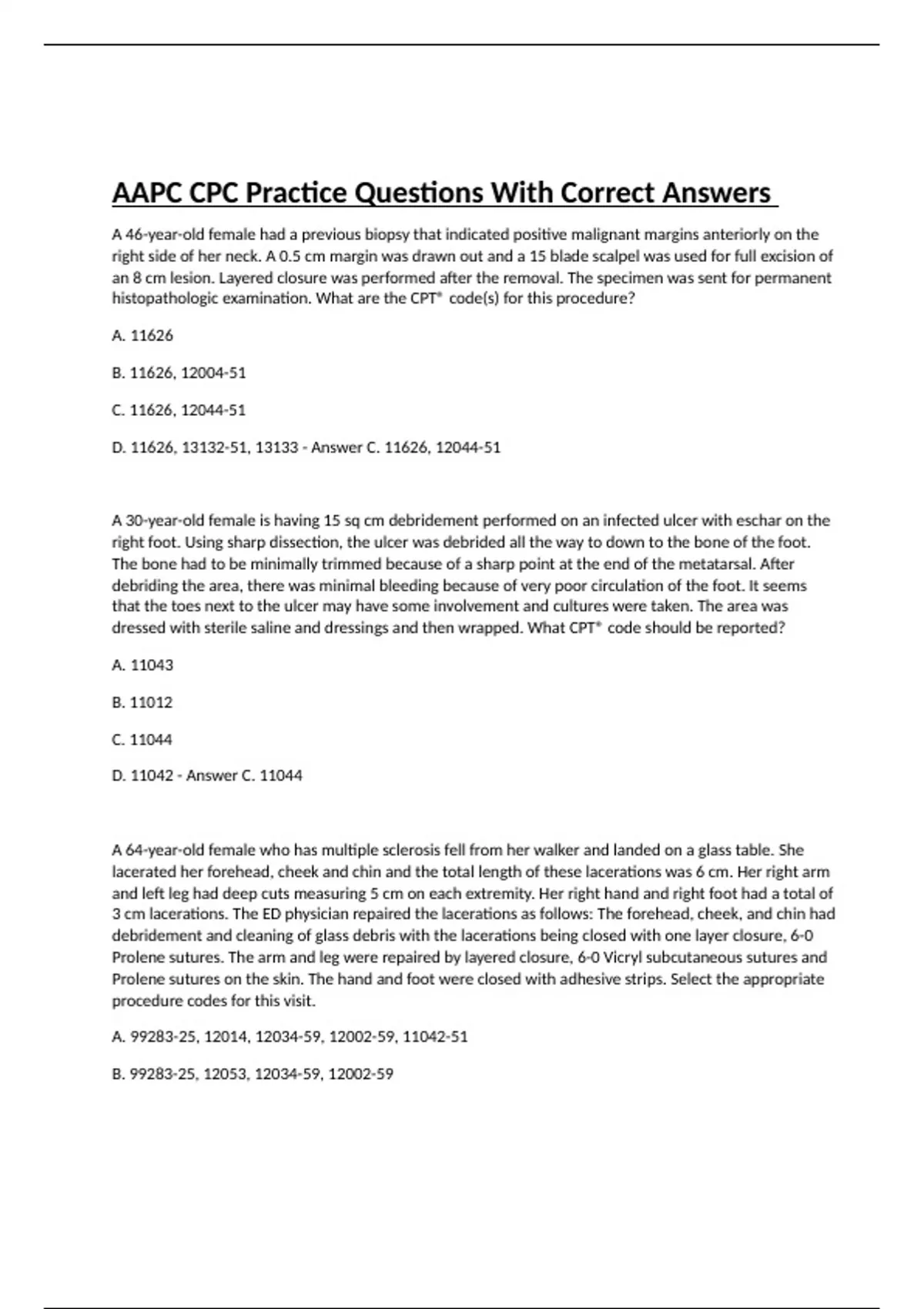 A 46-year-old female had a previous biopsy that indicated positive malignant margins anteriorly on the right side of her neck. A 0.5 cm margin was drawn out and a 15 blade scalpel was used for full excision of an 8 cm lesion. Layered closure was performed after the removal. The specimen was sent for permanent histopathologic examination. What are the CPT® code(s) for this procedure? A. 11626 B. 11626, 12004-51 C. 11626, 12044-51 D. 11626, 13132-51, 13133 - Answer C. 11626, 12044-51 A 30-year-old female is having 15 sq cm debridement performed on an infected ulcer with eschar on the right foot. Using sharp dissection, the ulcer was debrided all the way to down to the bone of the foot. The bone had to be minimally trimmed because of a sharp point at the end of the metatarsal. After debriding the area, there was minimal bleeding because of very poor circulation of the foot. It seems that the toes next to the ulcer may have some involvement and cultures were taken. The area was dressed with sterile saline and dressings and then wrapped. What CPT® code should be reported? A. 11043 B. 11012 C. 11044 D. 11042 - Answer C. 11044 A 64-year-old female who has multiple sclerosis fell from her walker and landed on a glass table. She lacerated her forehead, cheek and chin and the total length of these lacerations was 6 cm. Her right arm and left leg had deep cuts measuring 5 cm on each extremity. Her right hand and right foot had a total of 3 cm lacerations. The ED physician repaired the lacerations as follows: The forehead, cheek, and chin had debridement and cleaning of glass debris with the lacerations being closed with one layer closure, 6-0 Prolene sutures. The arm and leg were repaired by layered closure, 6-0 Vicryl subcutaneous sutures and Prolene sutures on the skin. The hand and foot were closed with adhesive strips. Select the appropriate procedure codes for this visit. A. 99283-25, 12014, 12034-59, 12002-59, 11042-51 B. 99283-25, 12053, 12034-59, 12002-59 C. 99283-25, 12014, 12034-59, 11042-51 D. 99283-25, 12053, 12034-59 - Answer D. 99283-25, 12053, 12034-59 A 52-year-old female has a mass growing on her right flank for several years. It has finally gotten significantly larger and is beginning to bother her. She is brought to the Operating Room for definitive excision. An incision was made directly overlying the mass. The mass was down into the subcutaneous tissue and the surgeon encountered a well encapsulated lipoma approximately 4 centimeters. This was excised primarily bluntly with a few attachments divided with electrocautery. What CPT® and ICD-10-CM codes are reported? A. 21932, D17.39 B. 21935, D17.1 C. 21931, D17.1 D. 21925, D17.9 - Answer C. 21931, D17.1 Question 5 PREOPERATIVE DIAGNOSIS: Right scaphoid fracture. TYPE OF PROCEDURE: Open reduction and internal fixation of right scaphoid fracture. DESCRIPTION OF PROCEDURE: The patient was brought to the operating room; anesthesia having been administered. The right upper extremity was prepped and draped in a sterile manner. The limb was elevated, exsanguinated, and a pneumatic arm tourniquet was elevated. An incision was made over the dorsal radial aspect of the right wrist. Skin flaps were elevated. Cutaneous nerve branches were identified and very gently retracted. The interval between the second and third dorsal compartment tendons was identified and entered. The respective tendons were retracted. A dorsal capsulotomy incision was made, and the fracture was visualized. There did not appear to be any type of significant defect at the fracture site. A 0.045 Kirschner wire was then used as a guidewire, extending from the proximal pole of the scaphoid distal ward. The guidewire was positioned appropriately and then measured. A 25-mm Acutrak® drill bit was drilled to 25 mm. A 22.5-mm screw was selected and inserted and rigid internal fixation was accomplished in this fashion. This was visualized under the OEC imaging device in multiple projections. The wound was irrigated and closed in layers. Sterile dressings were then applied. The patient tolerated the procedure well and left the operating room in stable condition. What CPT® code is reported for this procedure? A. 25628-RT B. 25624-RT C. 25645-RT D. 25651-RT - Answer A. 25628-RT An infant with genu valgum is brought to the operating room to have a bilateral medial distal femur hemiepiphysiodesis done. On each knee, the C-arm was used to localize the growth plate. With the growth plate localized, an incision was made medially on both sides. This was taken down to the fascia, which was opened. The periosteum was not opened. The Orthofix® figure-of-eight plate was placed and checked with X-ray. We then irrigated and closed the medial fascia with 0 Vicryl suture. The skin was closed with 2-0 Vicryl and 3-0 Monocryl®. What procedure code is reported? A. 27470-50 B. 27475-50 C. 27477-50 D. 27485-50 - Answer D. 27485-50 The patient is a 67-year-old gentleman with metastatic colon cancer recently operated on for a brain metastasis, now for placement of an Infuse-A-Port for continued chemotherapy. The left subclavian vein was located with a needle and a guide wire placed. This was confirmed to be in the proper position fluoroscopically. A transverse incision was made just inferior to this and a subcutaneous pocket created just inferior to this. After tunneling, the introducer was placed over the guide wire and the power port line was placed with the introducer and the introducer was peeled away. The tip was placed in the appropriate position under fluoroscopic guidance and the catheter trimmed to the appropriate length and secured to the power port device. The locking mechanism was fully engaged. The port was placed in the subcutaneous pocket and everything sat very nicely fluoroscopically. It was secured to the underlying soft tissue with 2-0 silk stitch. What CPT® code(s) is (are) reported for this procedure? A. 36556, 77001-26 B. 36558 C. 36561, 77001-26 D. 36571 - Answer C. 3656