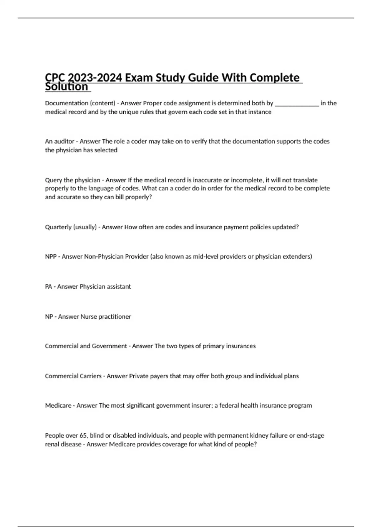 Documentation (content) - Answer Proper code assignment is determined both by _____________ in the medical record and by the unique rules that govern each code set in that instance An auditor - Answer The role a coder may take on to verify that the documentation supports the codes the physician has selected Query the physician - Answer If the medical record is inaccurate or incomplete, it will not translate properly to the language of codes. What can a coder do in order for the medical record to be complete and accurate so they can bill properly? Quarterly (usually) - Answer How often are codes and insurance payment policies updated? NPP - Answer Non-Physician Provider (also known as mid-level providers or physician extenders) PA - Answer Physician assistant NP - Answer Nurse practitioner Commercial and Government - Answer The two types of primary insurances Commercial Carriers - Answer Private payers that may offer both group and individual plans Medicare - Answer The most significant government insurer; a federal health insurance program People over 65, blind or disabled individuals, and people with permanent kidney failure or end-stage renal disease - Answer Medicare provides coverage for what kind of people? ESRD - Answer end-stage renal disease Medicare Part A - Answer Helps cover inpatient hospital care, as well as care provided in skilled nursing facilities, hospice care, and home healthcare, Medicare Part B - Answer Covers medically necessary physicians' services, outpatient care, and other medical services (including some preventive services) not covered under Medicare Part A. It can be an optional benefit. Medicare Part C - Answer Also called Medicare Advantage, combines the benefits of Medicare Part A, Part B, and-sometimes- Part D. The plans are managed by private insurers approved by Medicare. Medicare Part D - Answer A prescription drug program available to all Medicare beneficiaries. Medicaid - Answer A health insurance assistance program for some low-income people (especially children and pregnant women) sponsored by federal and state governments. RBRVS - Answer Resource-Based Relative Value Scale Resource-Based Relative Value Scale (RBRVS) - Answer Medicare payments for physician services are standardized using _____ and are divided into three components.