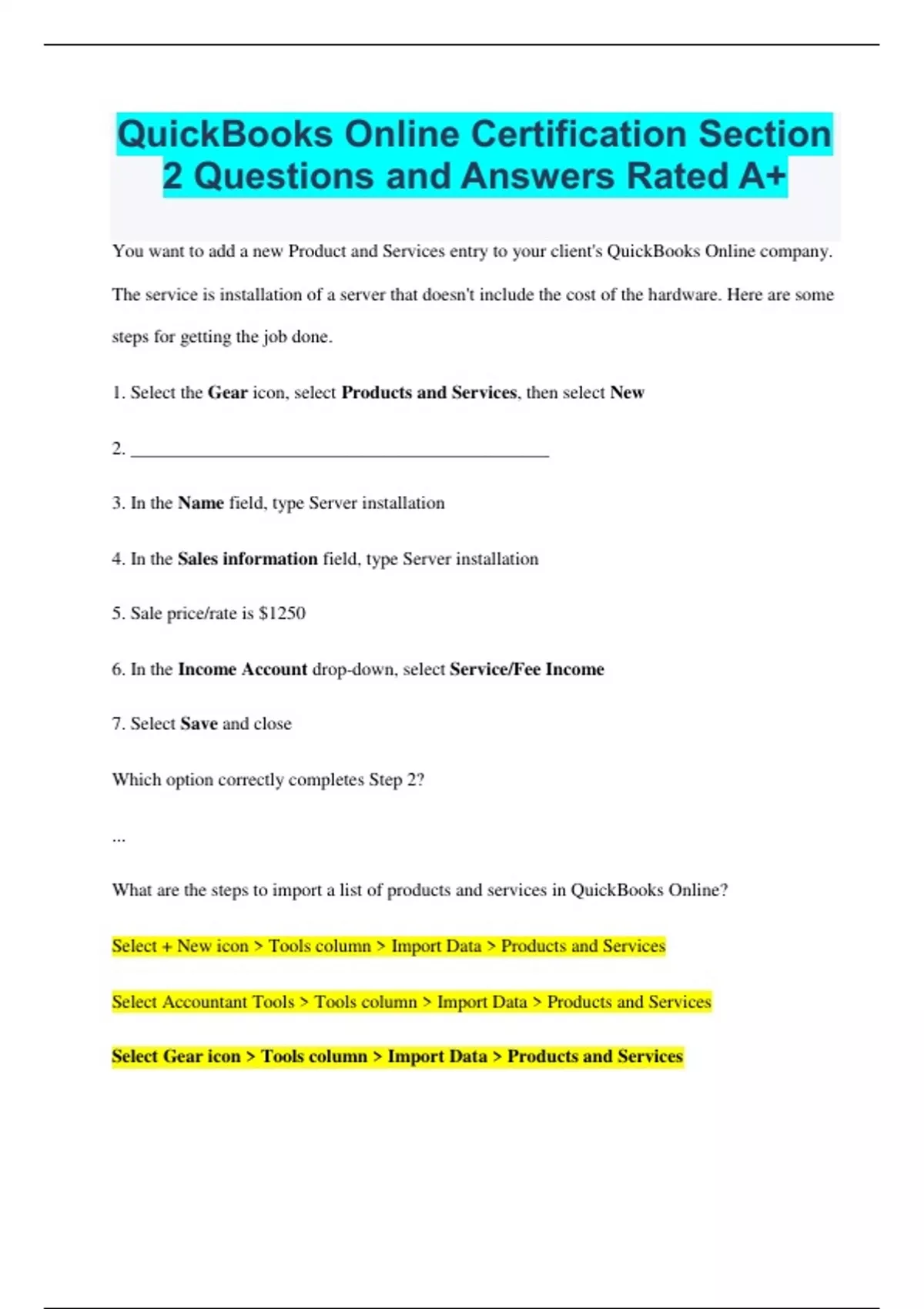 QuickBooks Online Certification Section 2 Questions and Answers Rated A+