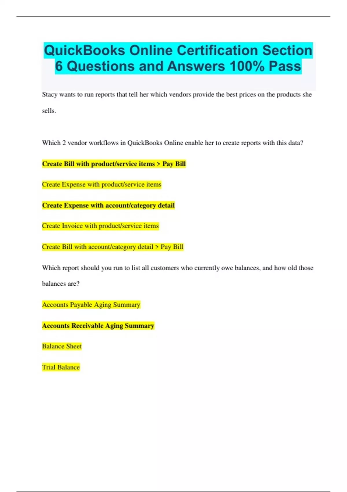 QuickBooks Online Certification Section 6 Questions and Answers 100% Pass