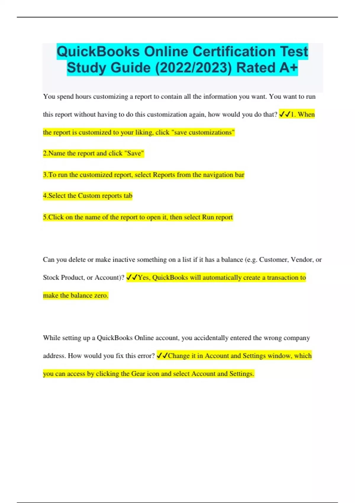 QuickBooks Online Certification Test Study Guide (2023/2024) Rated A+