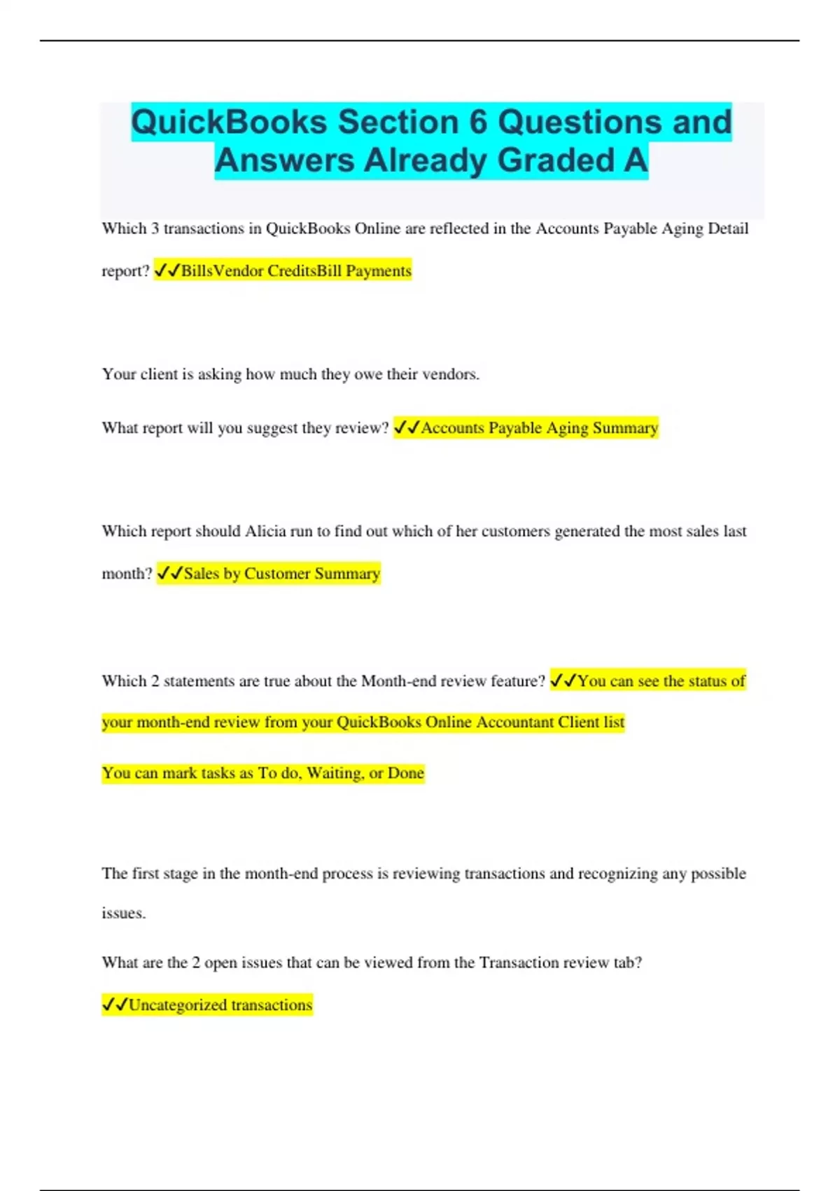 QuickBooks Section 6 Questions and Answers Already Graded A