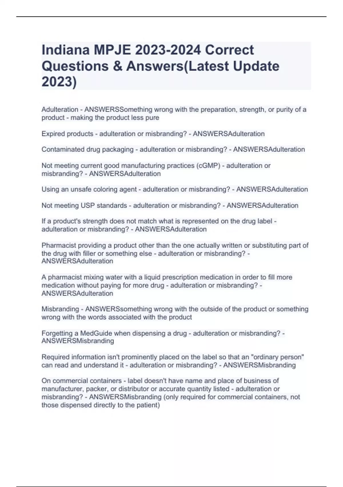 Adulteration - ANSWERSSomething wrong with the preparation, strength, or purity of a product - making the product less pure Expired products - adulteration or misbranding? - ANSWERSAdulteration Contaminated drug packaging - adulteration or misbranding? - ANSWERSAdulteration Not meeting current good manufacturing practices (cGMP) - adulteration or misbranding? - ANSWERSAdulteration Using an unsafe coloring agent - adulteration or misbranding? - ANSWERSAdulteration Not meeting USP standards - adulteration or misbranding? - ANSWERSAdulteration If a product's strength does not match what is represented on the drug label - adulteration or misbranding? - ANSWERSAdulteration Pharmacist providing a product other than the one actually written or substituting part of the drug with filler or something else - adulteration or misbranding? - ANSWERSAdulteration A pharmacist mixing water with a liquid prescription medication in order to fill more medication without paying for more drug - adulteration or misbranding? - ANSWERSAdulteration Misbranding - ANSWERSsomething wrong with the outside of the product or something wrong with the words associated with the product Forgetting a MedGuide when dispensing a drug - adulteration or misbranding? - ANSWERSMisbranding Required information isn't prominently placed on the label so that an "ordinary person" can read and understand it - adulteration or misbranding? - ANSWERSMisbranding On commercial containers - label doesn't have name and place of business of manufacturer, packer, or distributor or accurate quantity listed - adulteration or misbranding? - ANSWERSMisbranding (only required for commercial containers, not tho