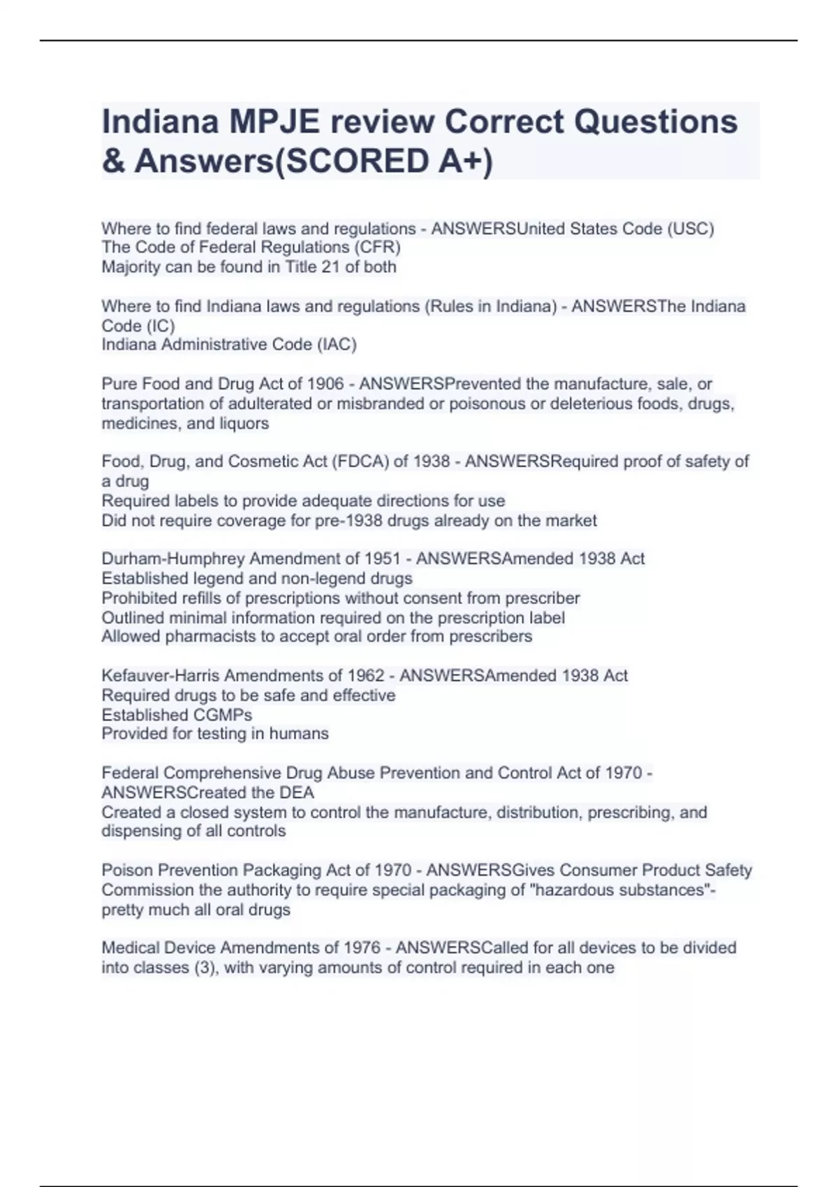 Where to find federal laws and regulations - ANSWERSUnited States Code (USC) The Code of Federal Regulations (CFR) Majority can be found in Title 21 of both Where to find Indiana laws and regulations (Rules in Indiana) - ANSWERSThe Indiana Code (IC) Indiana Administrative Code (IAC) Pure Food and Drug Act of 1906 - ANSWERSPrevented the manufacture, sale, or transportation of adulterated or misbranded or poisonous or deleterious foods, drugs, medicines, and liquors Food, Drug, and Cosmetic Act (FDCA) of 1938 - ANSWERSRequired proof of safety of a drug Required labels to provide adequate directions for use Did not require coverage for pre-1938 drugs already on the market Durham-Humphrey Amendment of 1951 - ANSWERSAmended 1938 Act Established legend and non-legend drugs Prohibited refills of prescriptions without consent from prescriber Outlined minimal information required on the prescription label Allowed pharmacists to accept oral order from prescribers Kefauver-Harris Amendments of 1962 - ANSWERSAmended 1938 Act Required drugs to be safe and effective Established CGMPs Provided for testing in humans Federal Comprehensive Drug Abuse Prevention and Control Act of 1970 - ANSWERSCreated the DEA Created a closed system to control the manufacture, distribution, prescribing, and dispensing of all controls Poison Prevention Packaging Act of 1970 - ANSWERSGives Consumer Product Safety