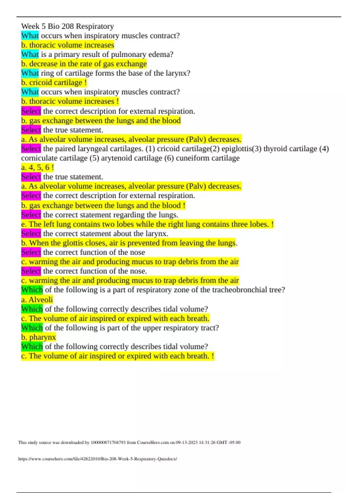 Bio 208 Week 5 Respiratory Quiz all answered 100% correct