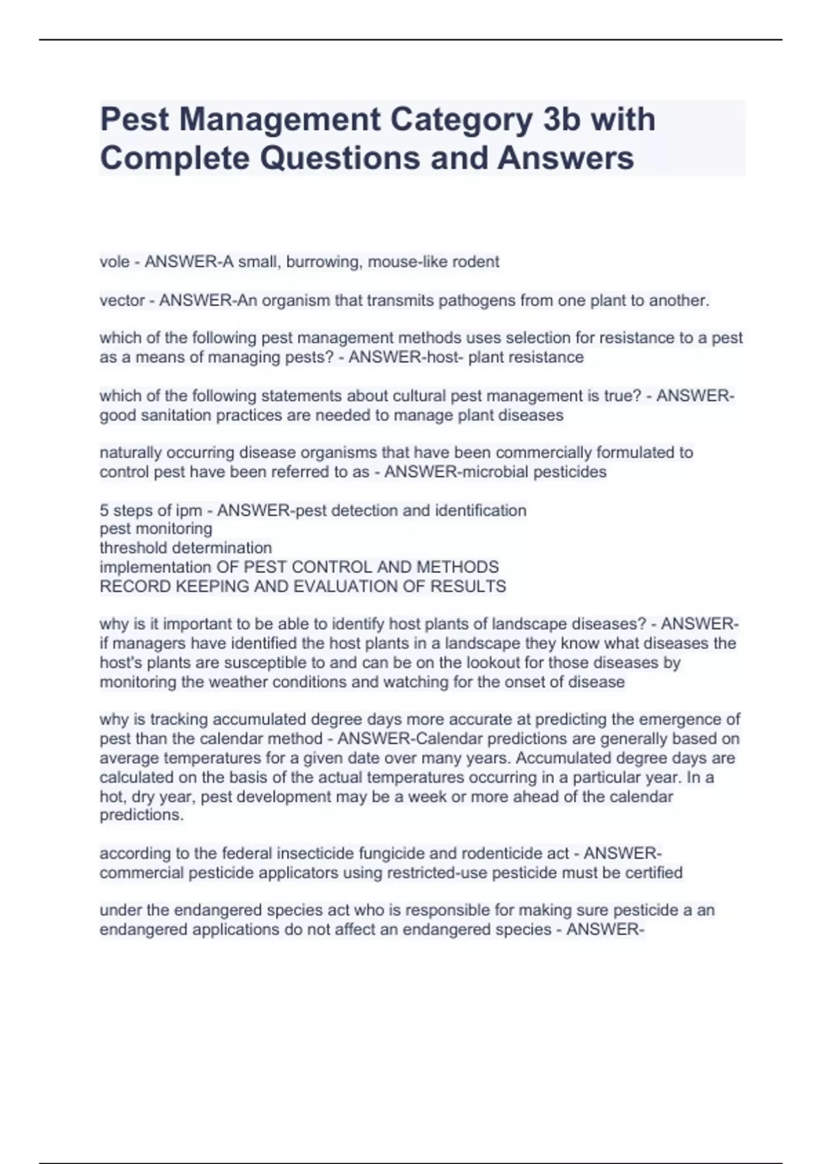 Pest Management Category 3b with Complete Questions and Answers Pest Management Category 3b with Complete Questions and Answers Pest Management Category 3b with Complete Questions and Answersvole - ANSWER-A small, burrowing, mouse-like rodent vector - ANSWER-An organism that transmits pathogens from one plant to another. which of the following pest management methods uses selection for resistance to a pest as a means of managing pests? - ANSWER-host- plant resistance which of the following statements about cultural pest management is true? - ANSWER-good sanitation practices are needed to manage plant diseases naturally occurring disease organisms that have been commercially formulated to control pest have been referred to as - ANSWER-microbial pesticides 5 steps of ipm - ANSWER-pest detection and identification pest monitoring threshold determination