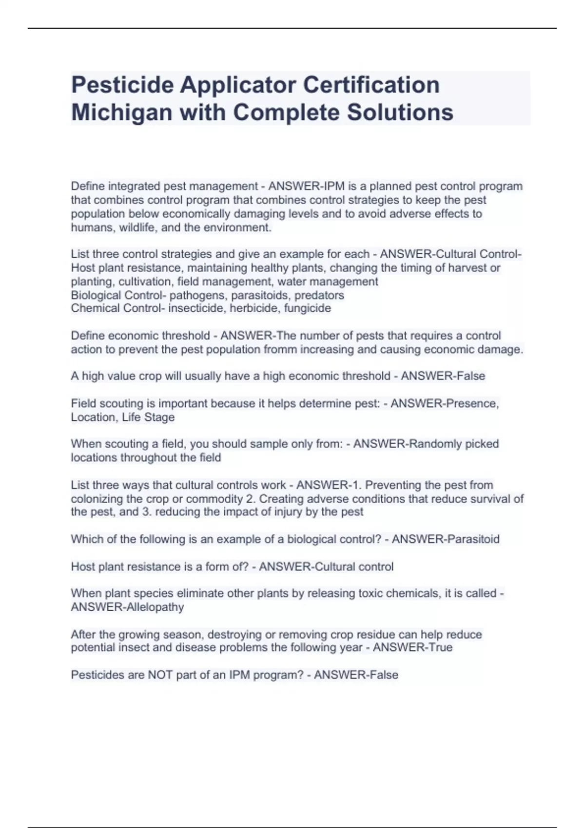 Pesticide Applicator Certification Michigan with Complete Solutions Pesticide Applicator Certification Michigan with Complete Solutions Pesticide Applicator Certification Michigan with Complete Solutions Define integrated pest management - ANSWER-IPM is a planned pest control program that combines control program that combines control strategies to keep the pest population below economically damaging levels and to avoid adverse effects to humans, wildlife, and the environment. List three control strategies and give an example for each - ANSWER-Cultural Control- Host plant resistance, maintaining healthy plants, changing the timing of harvest or planting, cultivation, field management, water management Biological Control- pathogens, parasitoids, predators Chemical Control- insecticide, herbicide, fungicide Define economic threshold - ANSWER-The number of pests that requires a control action to prevent the pest population fromm increasing and causing economic damage. A high value crop will usually have a high economic threshold - ANSWER-False Field scouting is important because it helps determine pest: - ANSWER-Presence, Location, Life Stage When scouting a field, you should sample only from: - ANSWER-Randomly picked locations throughout the field List three ways that cultural controls work - ANSWER-1. Preventing the pest from colonizing the crop or commodity 2. Creating adverse conditions that reduce survival of the pest, and 3. reducing the impact of injury by the pest Which of the following is an example of a biological control? - ANSWER-Parasitoid Host plant resistance is a form of? - ANSWER-Cultural control