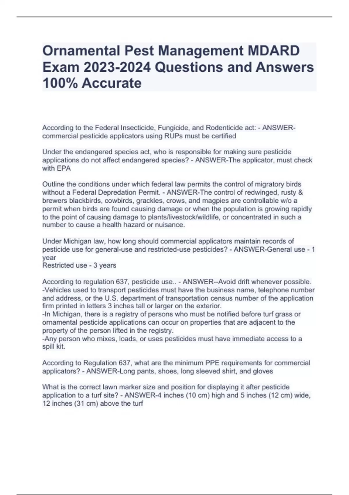Ornamental Pest Management MDARD Exam Questions and Answers 100% Accurate Ornamental Pest Management MDARD Exam Questions and Answers 100% Accurate Ornamental Pest Management MDARD Exam Questions and Answers 100% Accurate According to the Federal Insecticide, Fungicide, and Rodenticide act: - ANSWER-commercial pesticide applicators using RUPs must be certified Under the endangered species act, who is responsible for making sure pesticide applications do not affect endangered species? - ANSWER-The applicator, must check with EPA Outline the conditions under which federal law permits the control of migratory birds without a Federal Depredation Permit. - ANSWER-The control of redwinged, rusty & brewers blackbirds, cowbirds, grackles, crows, and magpies are controllable w/o a permit when birds are found causing damage or when the population is growing rapidly to the point of causing damage to plants/livestock/wildlife, or concentrated in such a number to cause a health hazard or nuisance. Under Michigan law, how long should commercial applicators maintain records of pesticide use for general-use and restricted-use pesticides? - ANSWER-General use - 1 year Restricted use - 3 years According to regulation 637, pesticide use.. - ANSWER--Avoid drift whenever possible. -Vehicles used to transport pesticides must have the business name, telephone number and address, or the U.S. department of transportation census number of the application firm printed in letters 3 inches tall or larger on the exterior. -In Michigan, there is a registry of persons who must be notified before turf grass or ornamental pesticide applications can occur on properties that are adjacent to the property of the person lifted in the registry. -Any person who mixes, loads, or uses pesticides must have immediate access to a spill kit. According to Regulation 637, what are the minimum PPE requirements for commercial applicators? - ANSWER-Long pants, shoes, long sleeved shirt, and gloves What is the correct lawn marker size and position for displaying it after pesticide application to a turf site? - ANSWER-4 inches (10 cm) high and 5 inches (12 cm) wide, 12 inches (31 cm) above the turf
